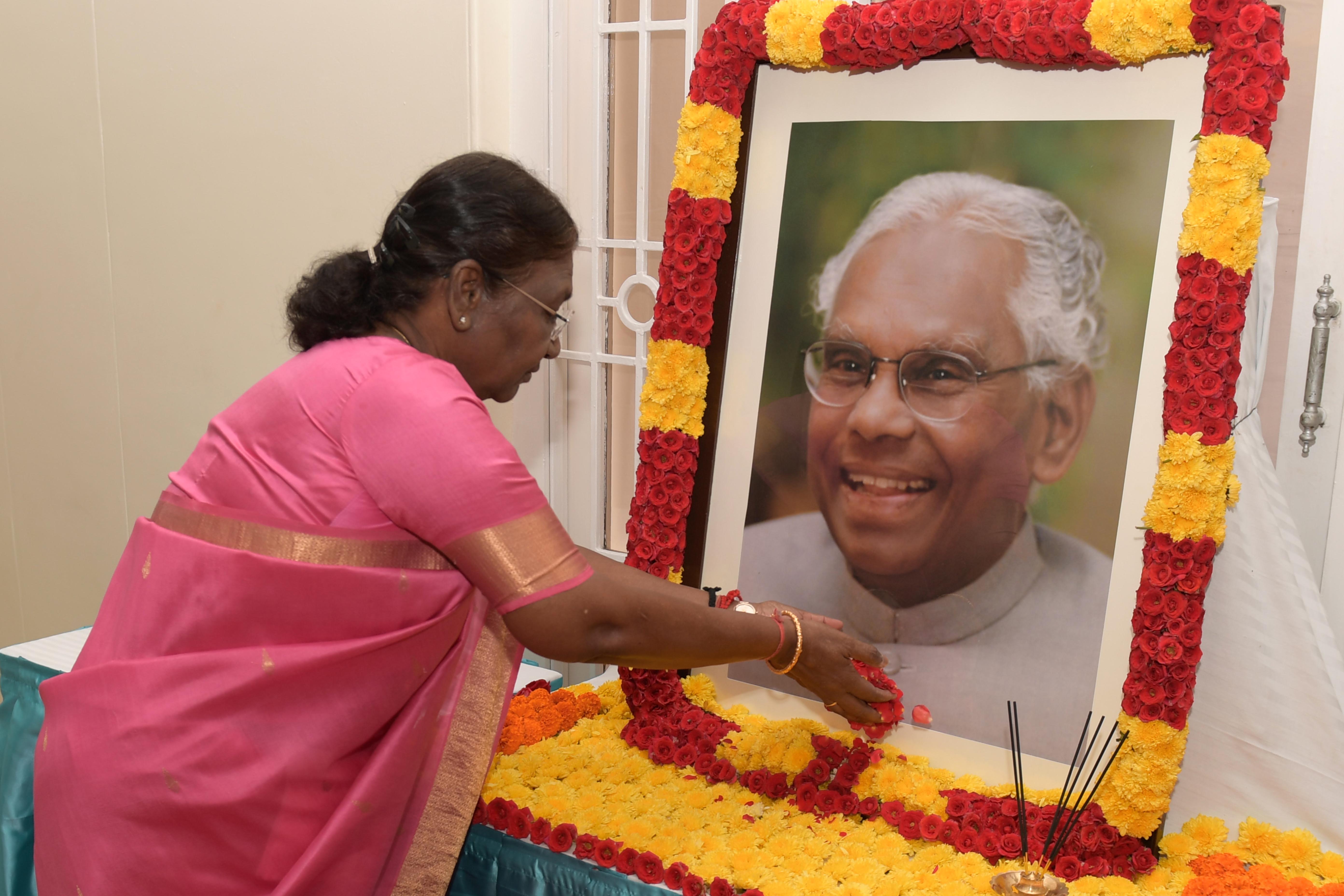The President of India, Smt. Droupadi Murmu paying floral tributes at the portrait of the former President of India, Shri K.R.Narayanan on his Birth Anniversary at Raj Bhavan, Chennai on October 27, 2023.