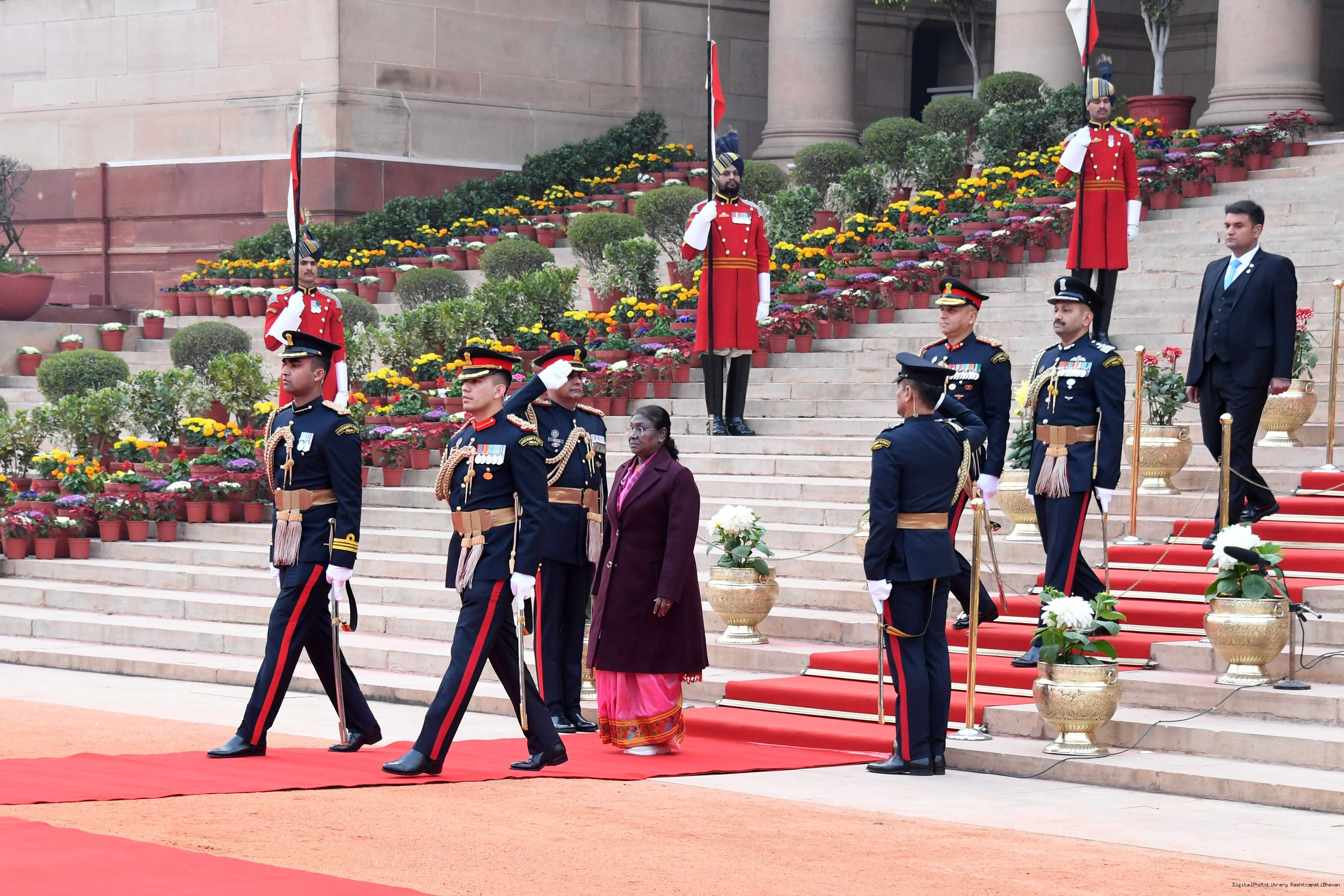 The PBG presenting the National Salute to the President of India, Smt Droupadi Murmu at Rashtrapati Bhavan in New Delhi on Jan 29, 2024.