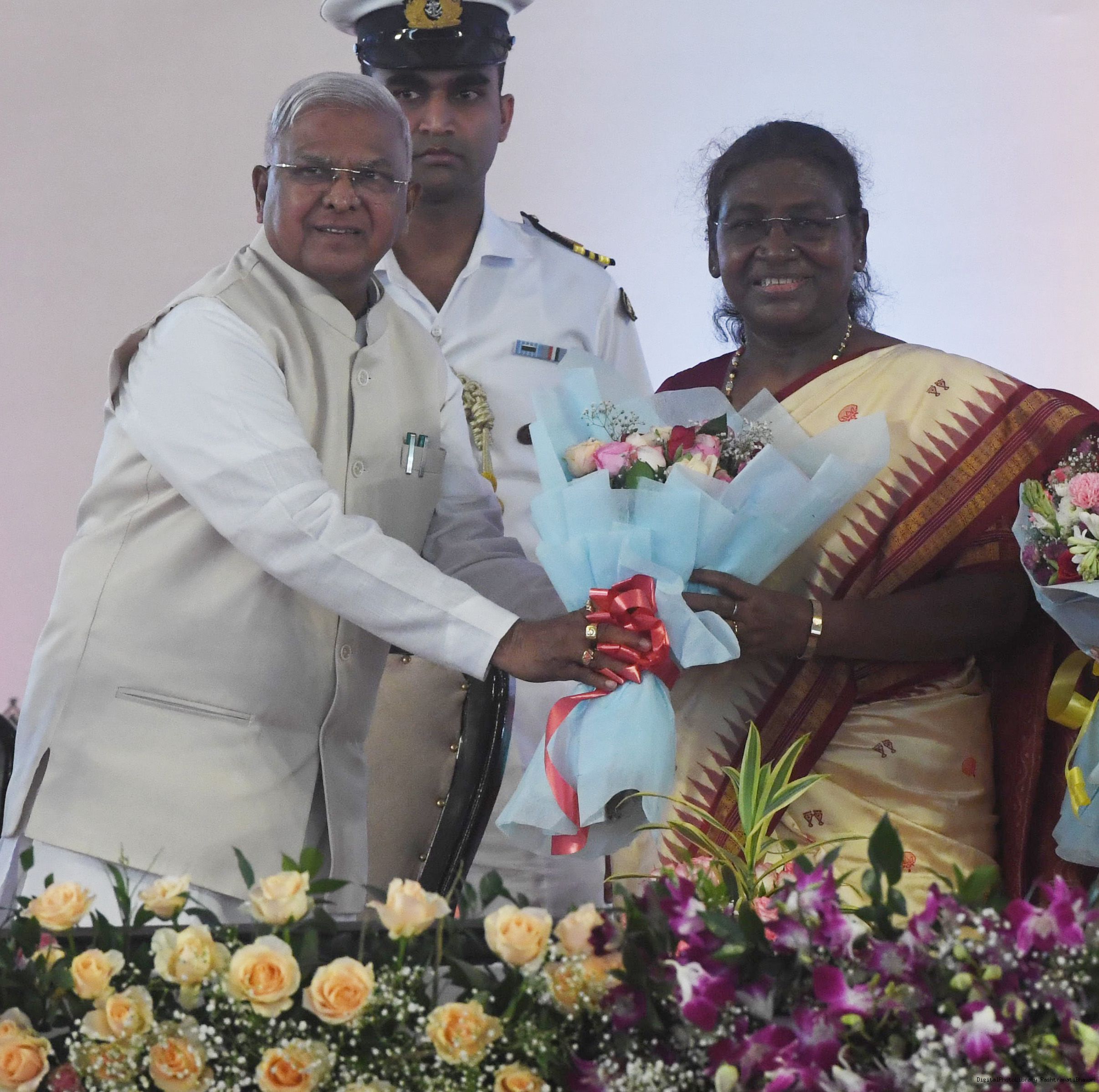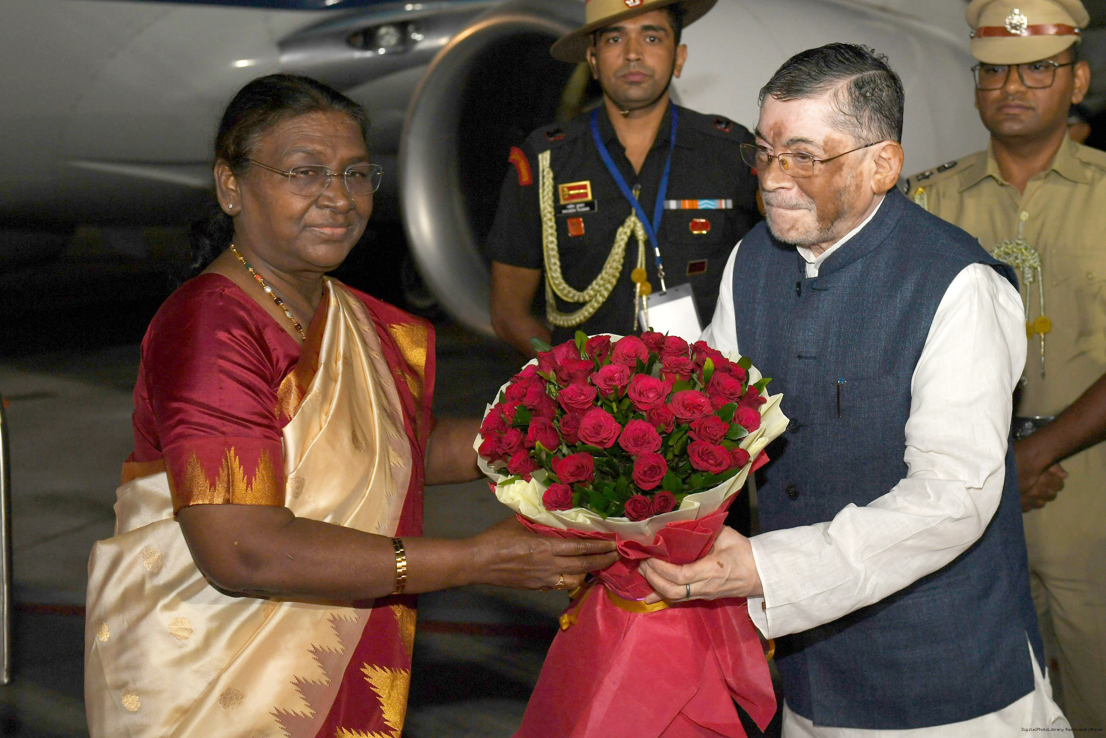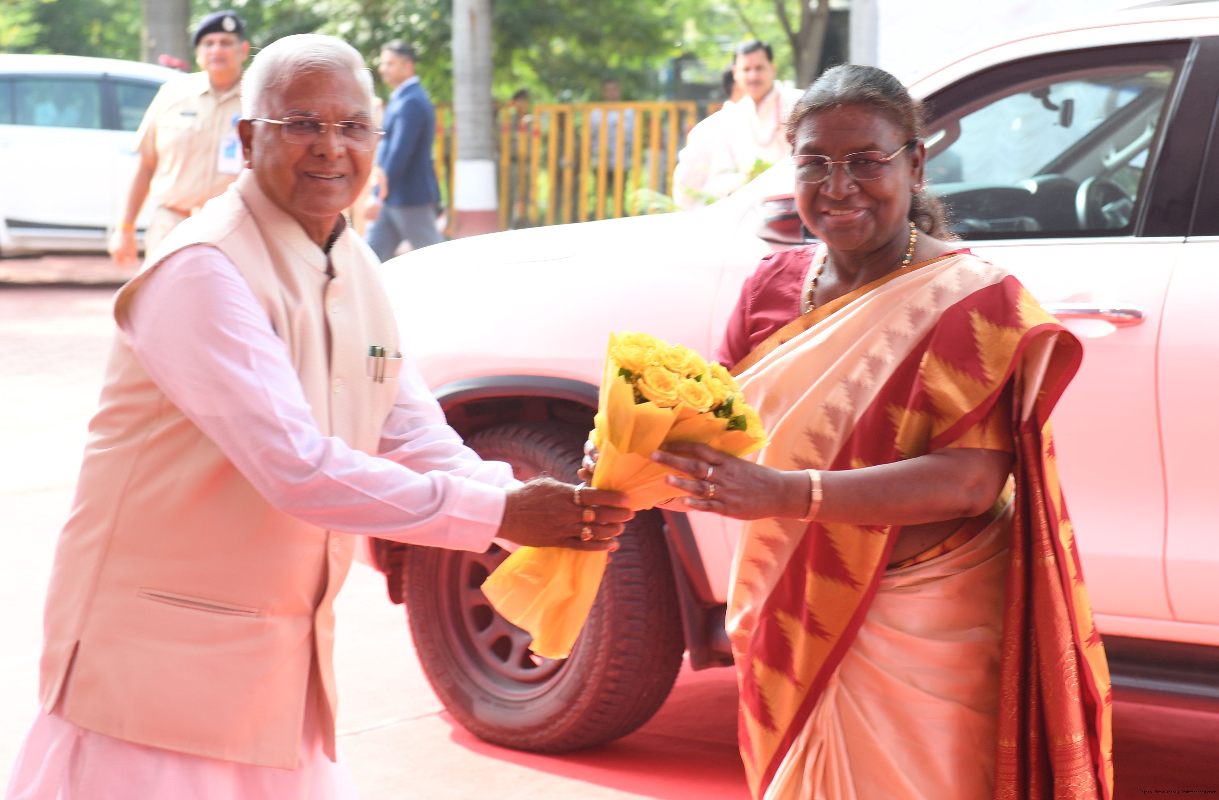 The Governor of Jharkhand, Shri Santosh Kumar Gangwar, Union Minister of Agriculture Farmers Welfare and Rural Development Shri Shivraj Singh Chouhan and Chief Minister Shri Hemant Soren received the President of India Smt. Droupadi Murmu on her arrival in Ranchi on September 19, 2024.