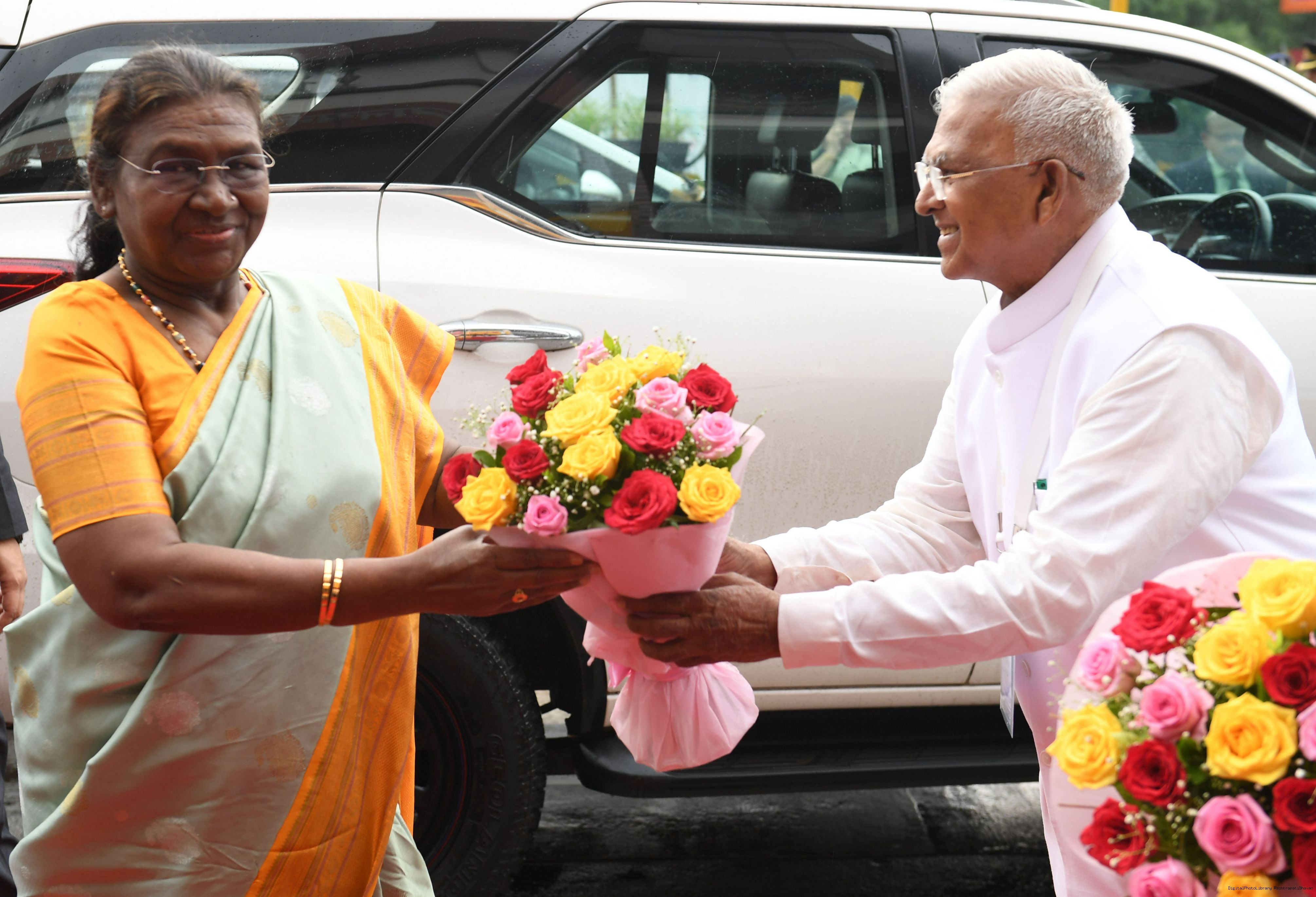 The Governor of Telangana, Shri Jishnu Dev Varma and the Chief Minister, Shri A. Revanth Reddy received the President of India Smt. Droupadi Murmu on her arrival at Hyderabad on September 28, 2024.