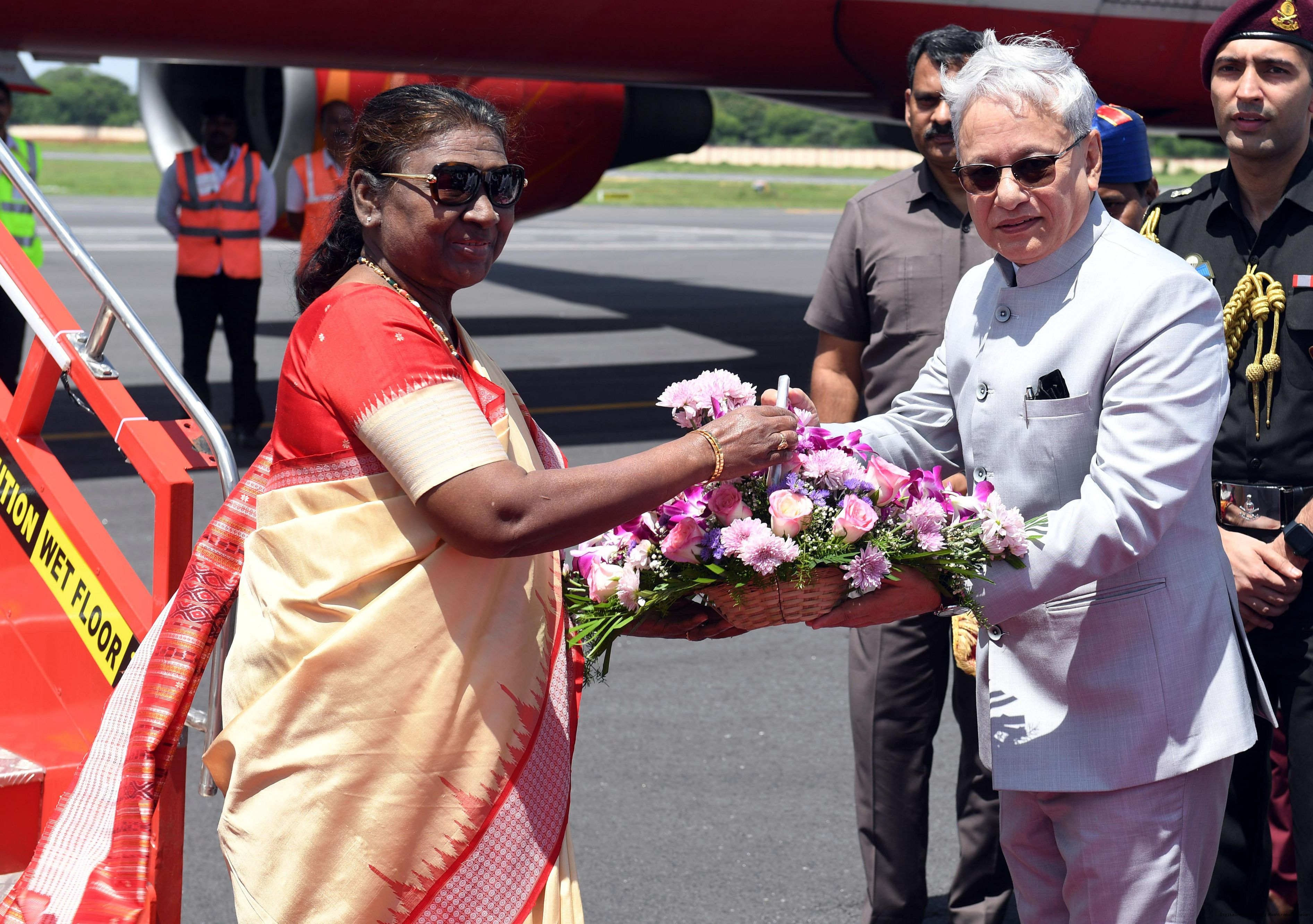 The Lt. Governor of Ladakh Brig. (Dr.) B D Mishra received President Droupadi Murmu on her arrival at Thoise Airfield, Ladakh on September 26, 2024.