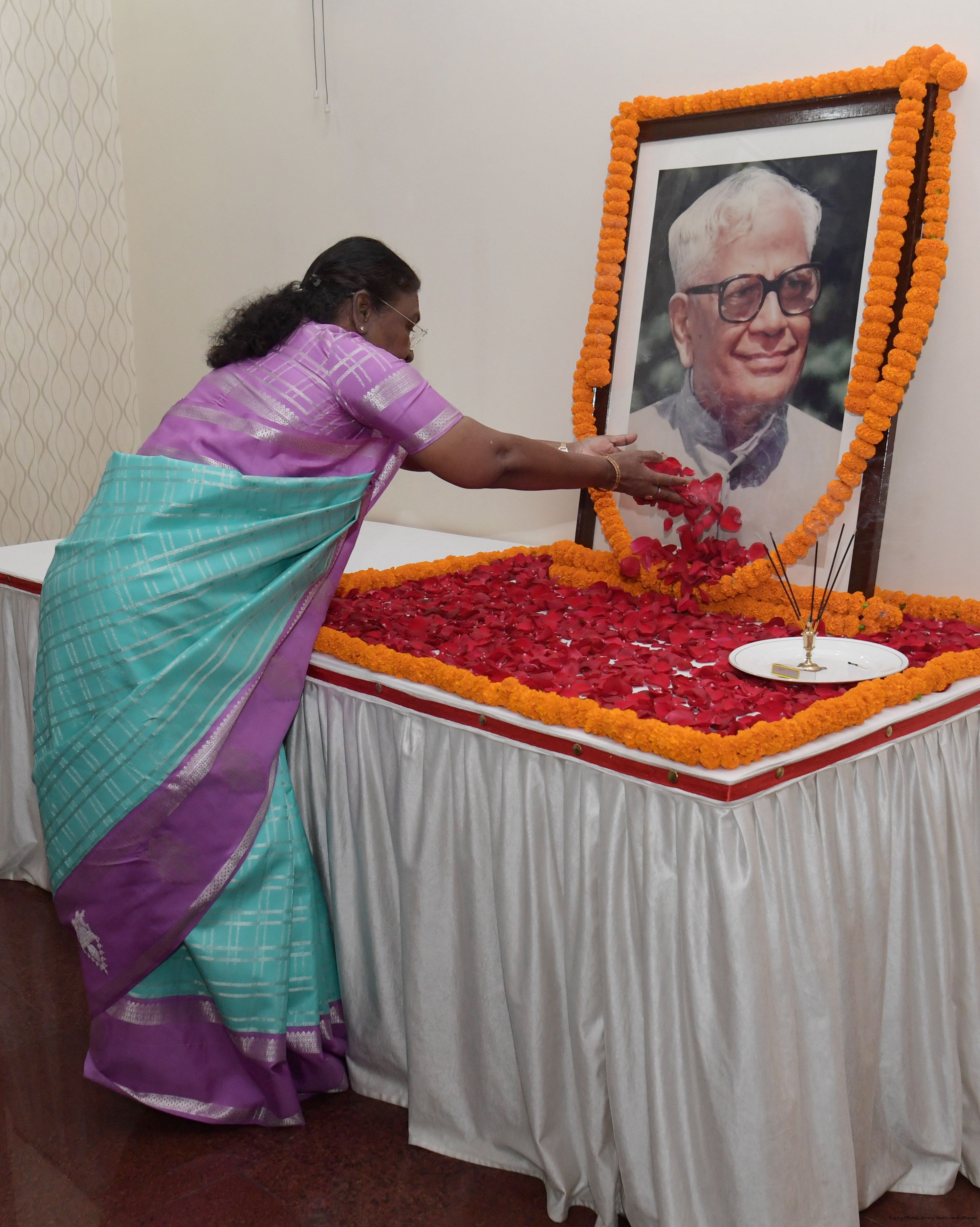 The President of India, Smt Droupadi Murmu paid floral tributes to Shri R. Venkataraman, former President of India, on his birth anniversary at Raj Bhavan, Bhubaneswar on December 4, 2024.