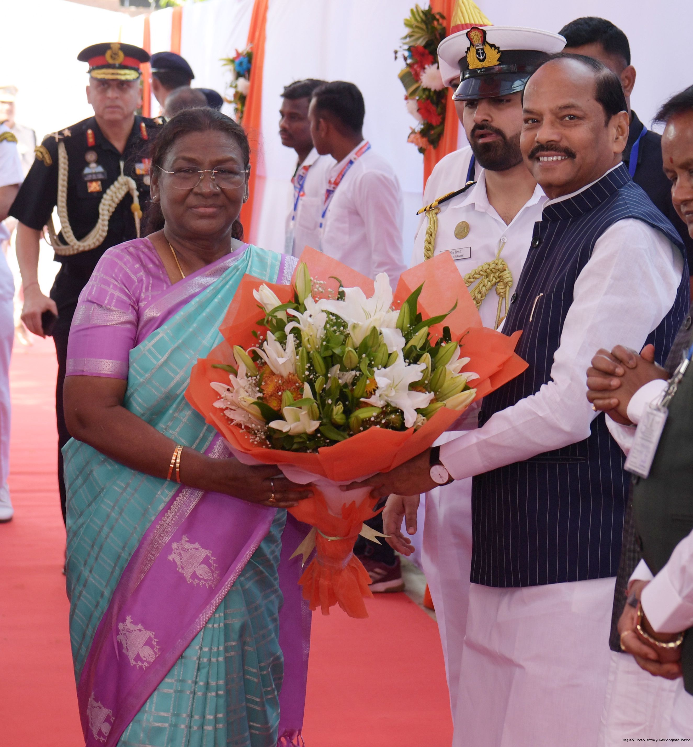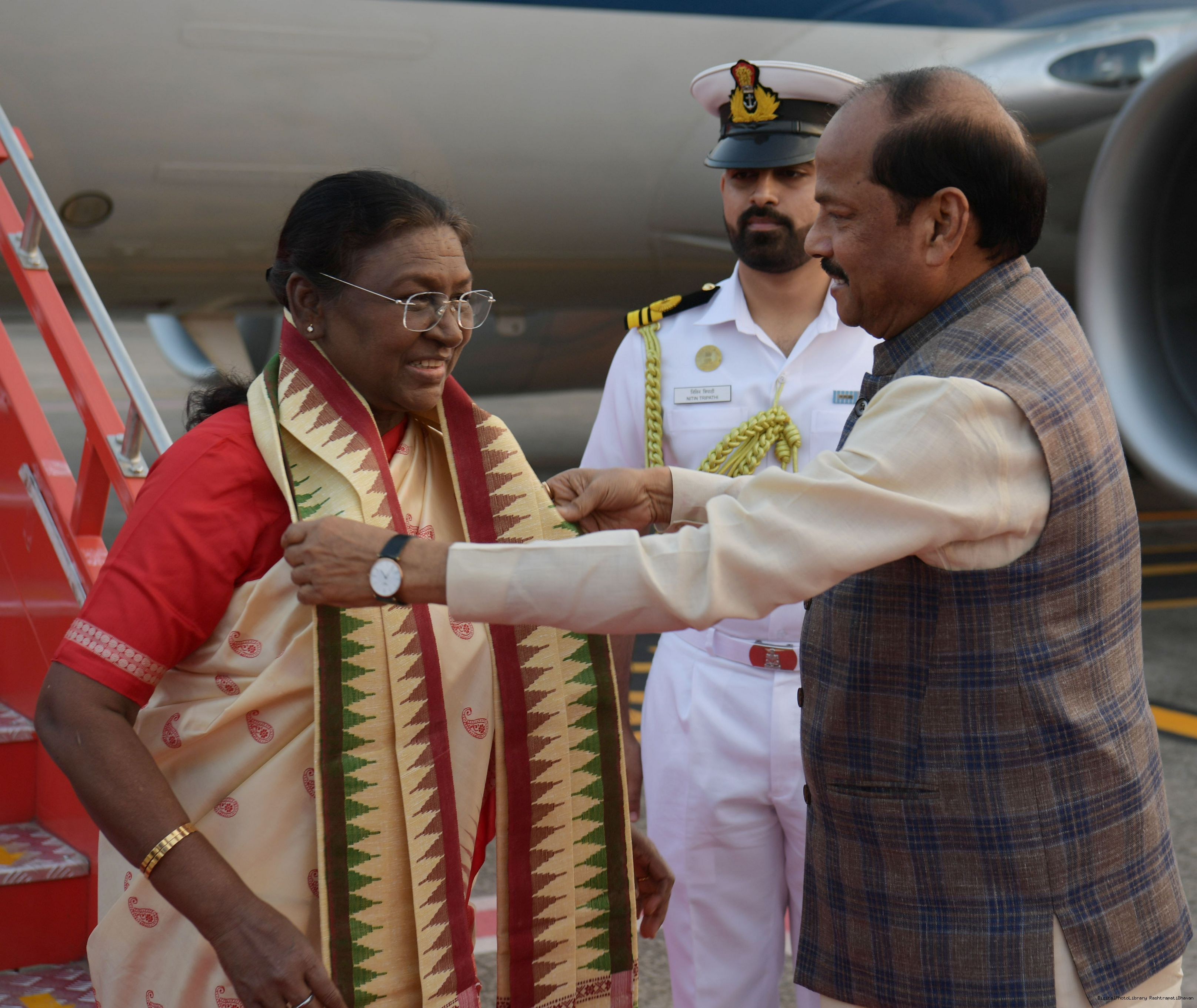 The Governor of Odisha, Shri Raghubar Das and Chief Minister, Shri Mohan Charan Majhi received the President of India Smt. Droupadi Murmu on her arrival in Bhubaneswar on December 3, 2024.