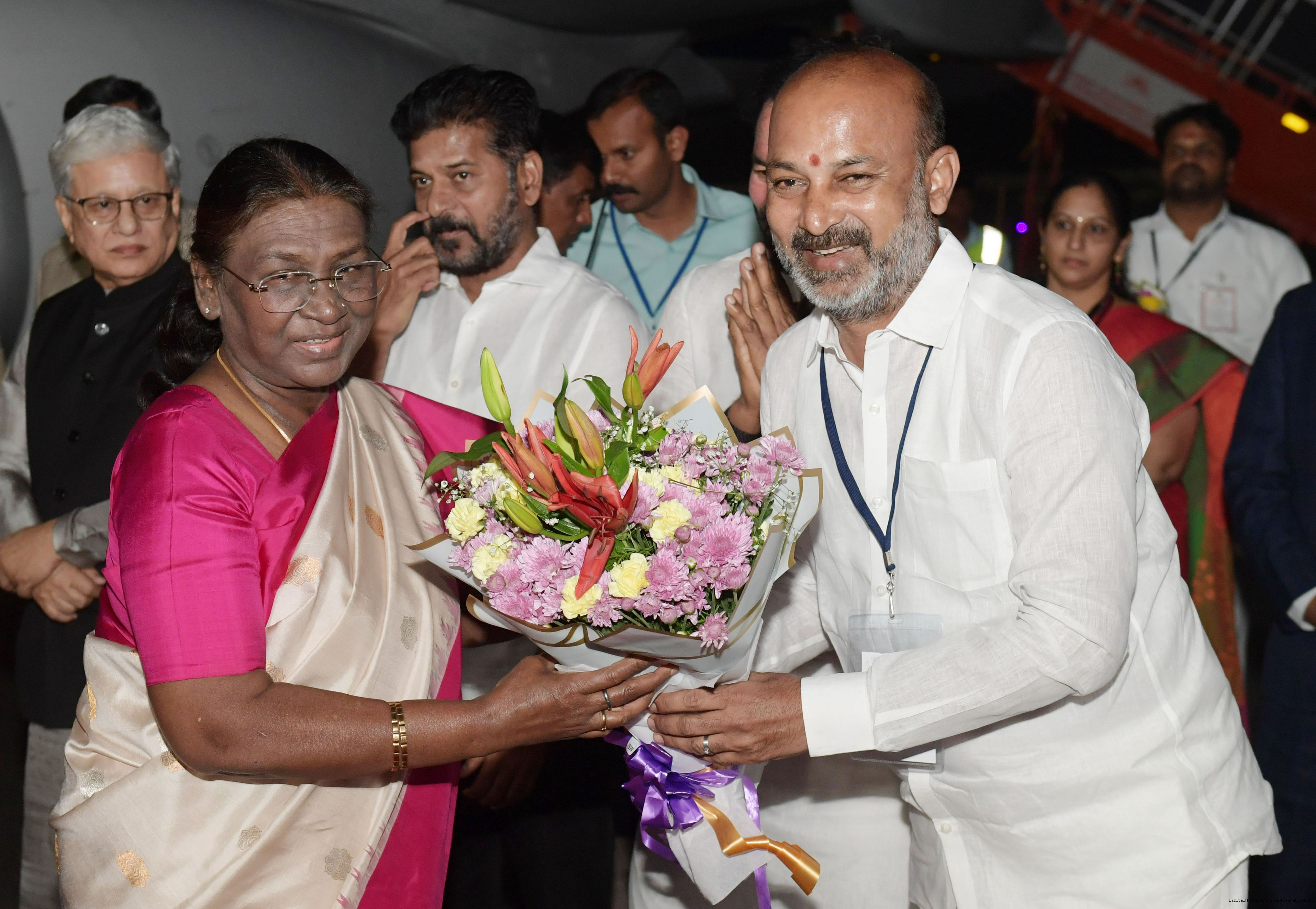 The Governor of Telangana, Shri Jishnu Dev Varma, Chief Minister Shri A. Revanth Reddy, Union Minister for Coal and Mines, Shri G. Kishan Reddy and Minister of State for Home Affairs, Shri Bandi Sanjay Kumar received the President of India Smt. Droupadi Murmu on her arrival at Hyderabad on November 21, 2024.