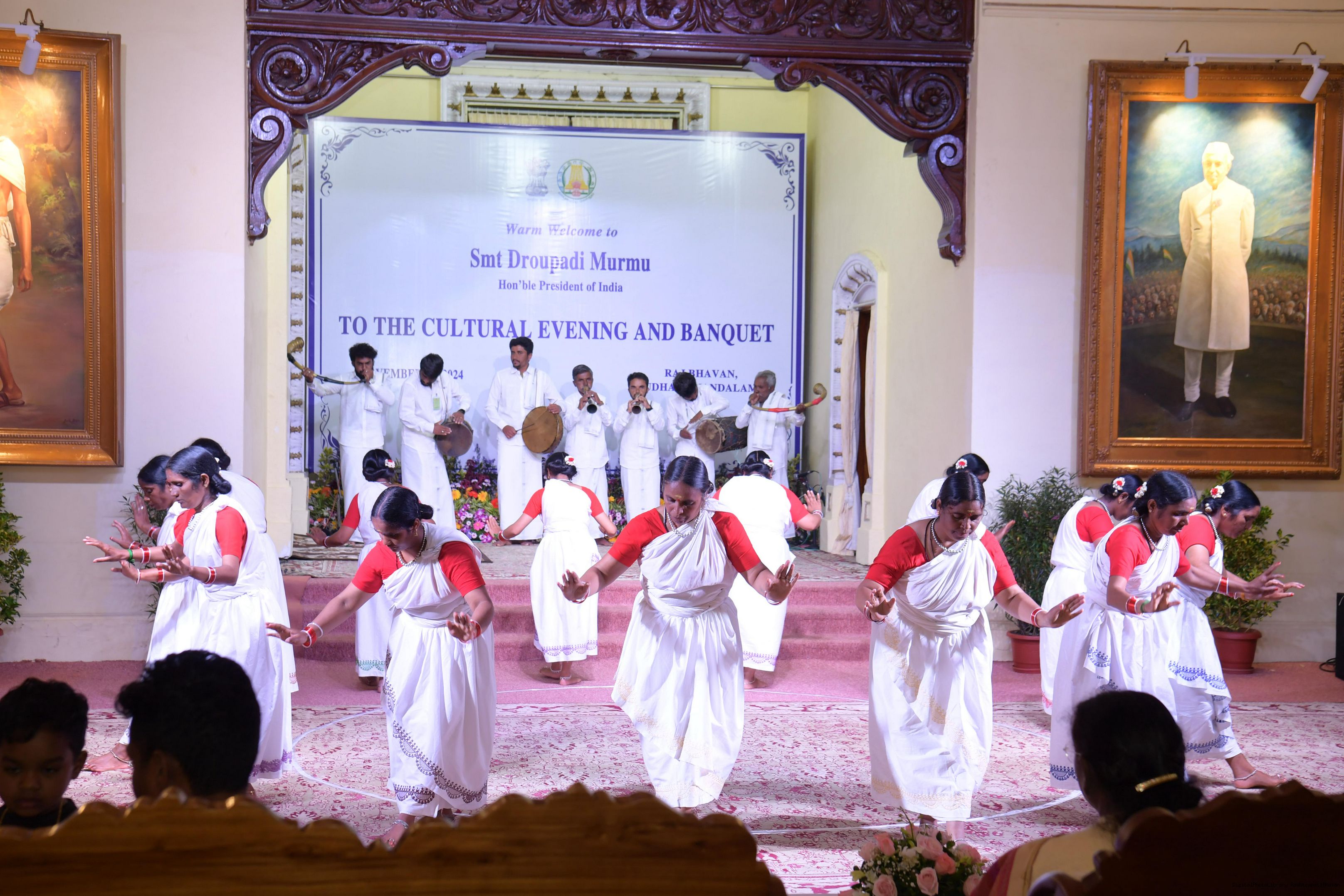 The President of India Smt. Droupadi Murmu witnessing Cultural Programme in Ballroom of at Raj Bhavan Ooty, Tamil Nadu on November 29, 2024.