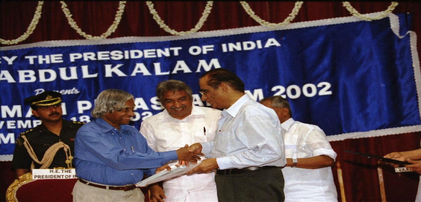 The President of India, Dr A P J Abdul Kalam presenting the Swadesabhimani Puraskar 2002 to Shri V K Madhavan Kutty at Kanakakunnu in Kerala on Nov 18, 2002