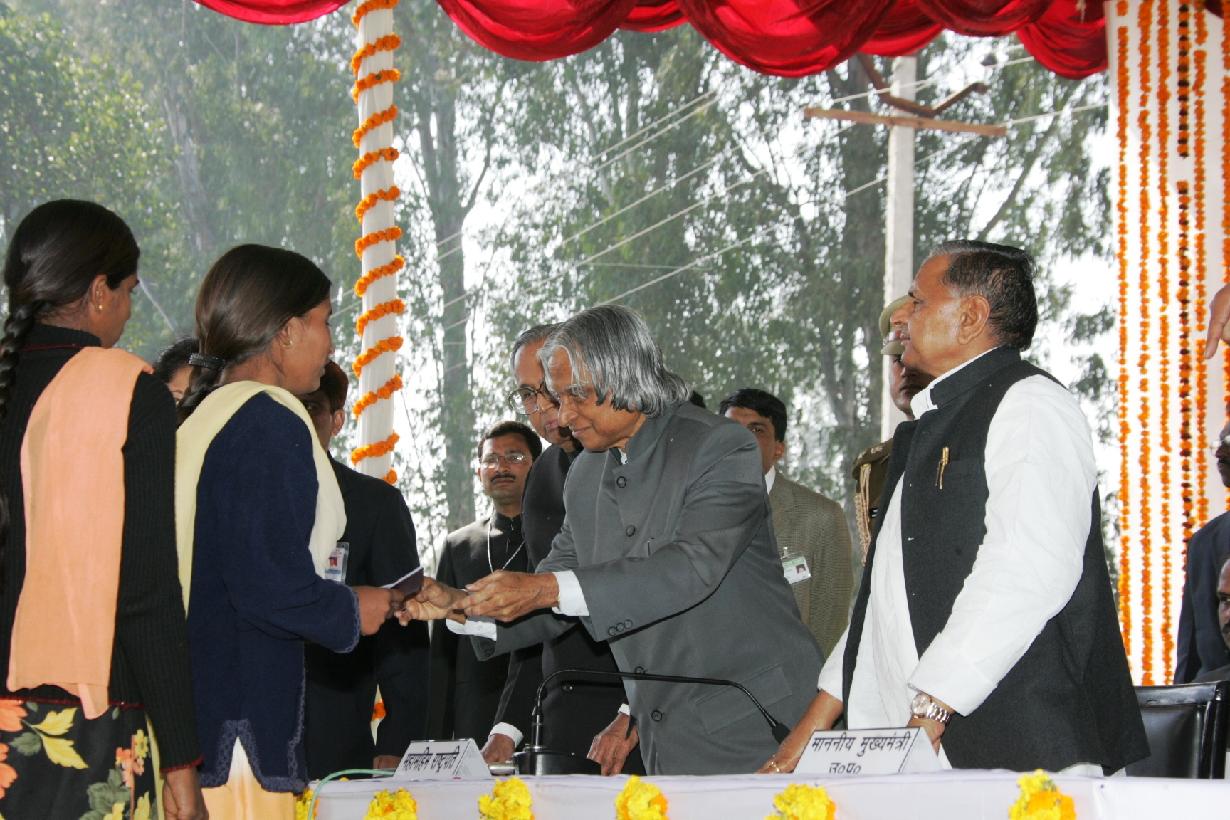 The President of India, Dr A P J Abdul Kalam visiting an Exhibition on 'Developmental and Educational Works', Distributes Cheques Under Kanya Vidhya Dhan Scheme at Village Rudahi at Lucknow in Uttar Pradesh on Jan 14, 2005