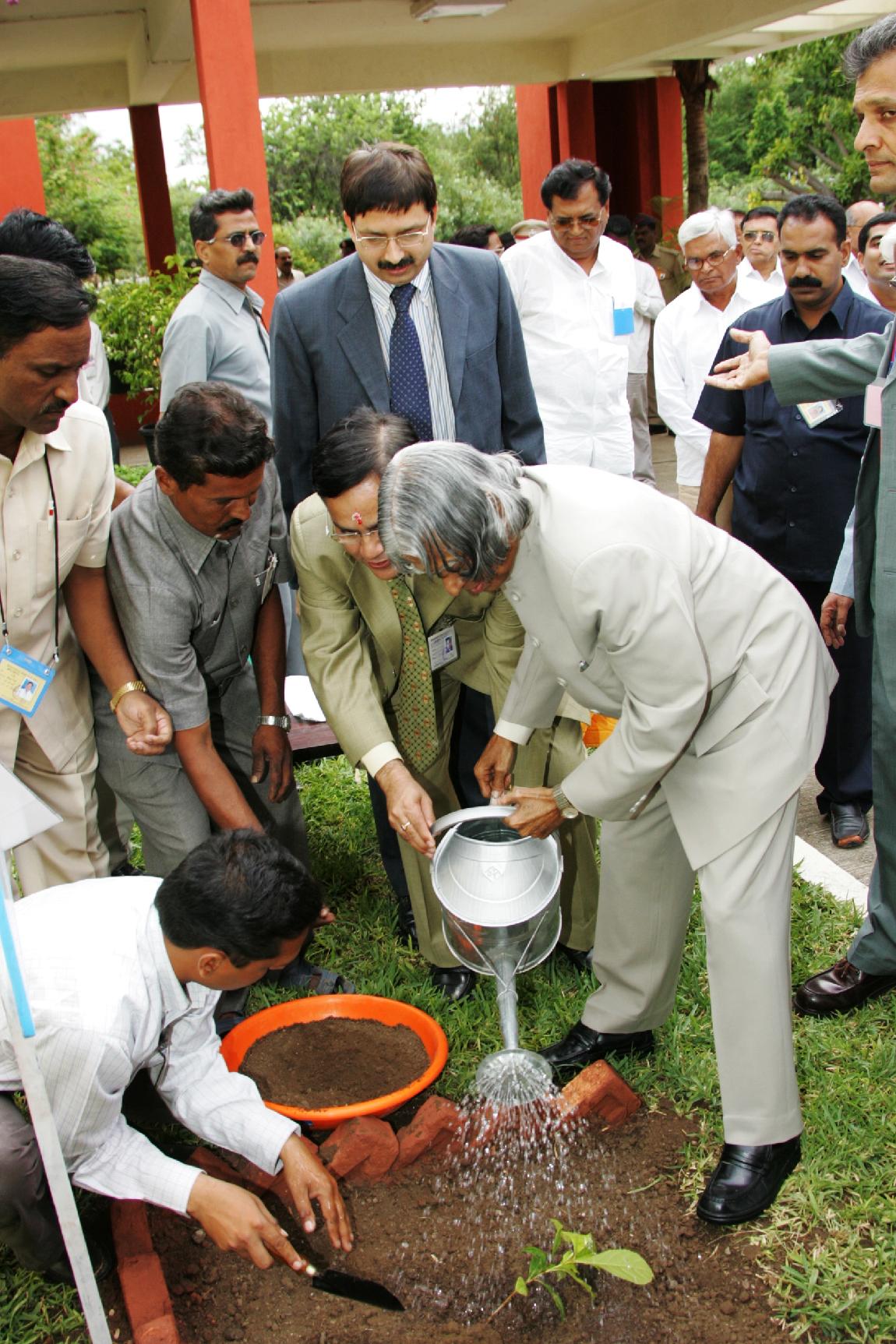 The President of India, Dr A P J Abdul Kalam interacting with the Farmers through Video Conference and planting a sapling during his visit to Pravara Medical Trust, Loni District of Ahmednagar in Maharashtra on Oct 15, 2005