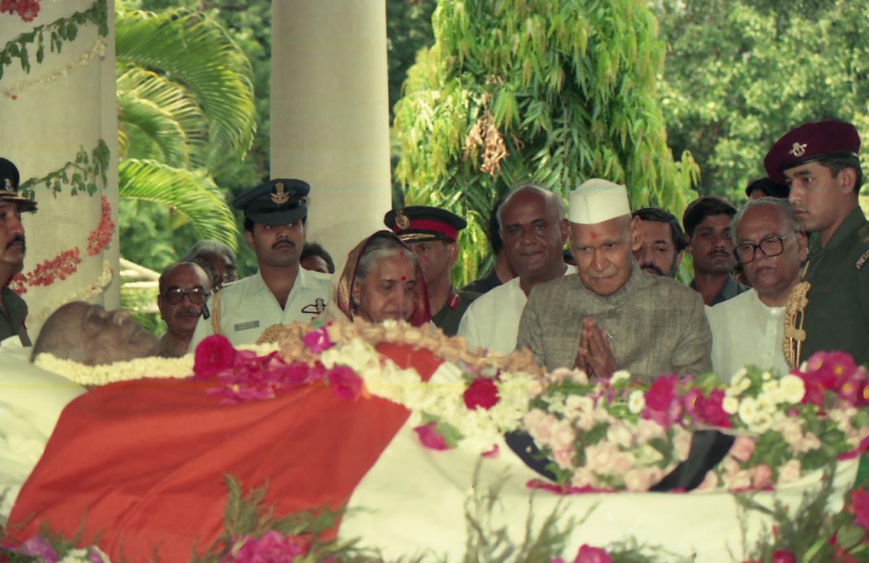 The President of India, Dr. Shankar Dayal Sharma paying homage at the mortal remains of former President, Shri N Sanjiva Reddy, at Bangalore, Karnataka on June 02, 1996.