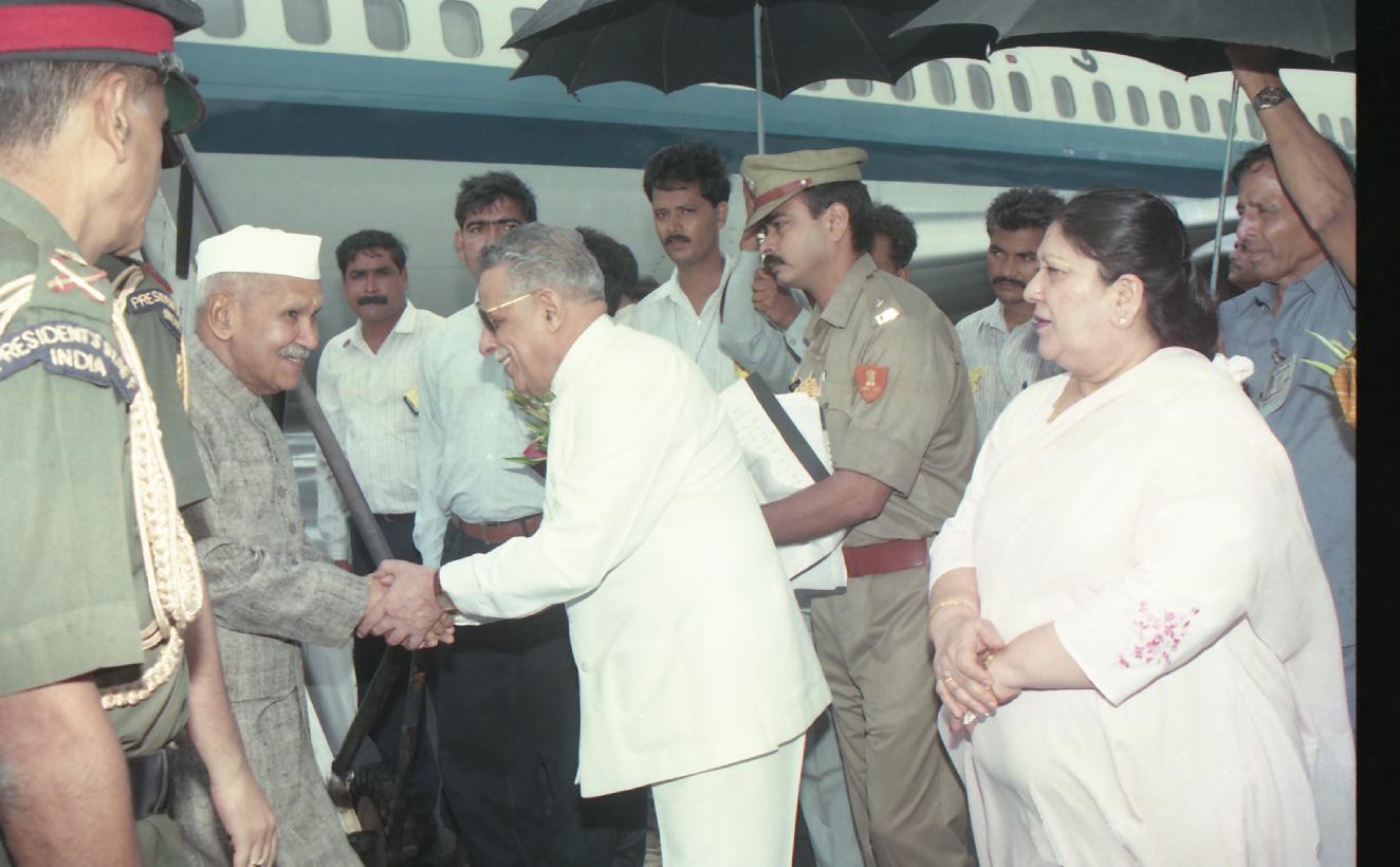 The President of India, Dr. Shankar Dayal Sharma being received by the Governor, Madhya Pradesh, Shri Mohammad Shafi Qureshi and the Chief Minister, Madhya Pradesh, Shri Digvijaya Singh, at Bhopal, Madhya Pradesh on August 02, 1996.