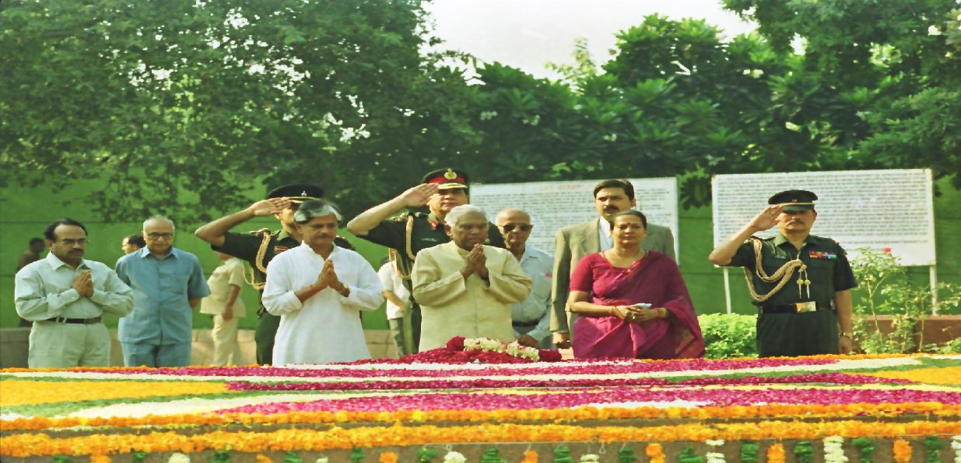 The President of India, Shri K R Narayanan paying homage to the Former Prime Minister of India, Late Shri Lal Bahadur Shastri on the occasion of his Birth Anniversary at Vijay Ghat in New Delhi on Oct 02, 2000
