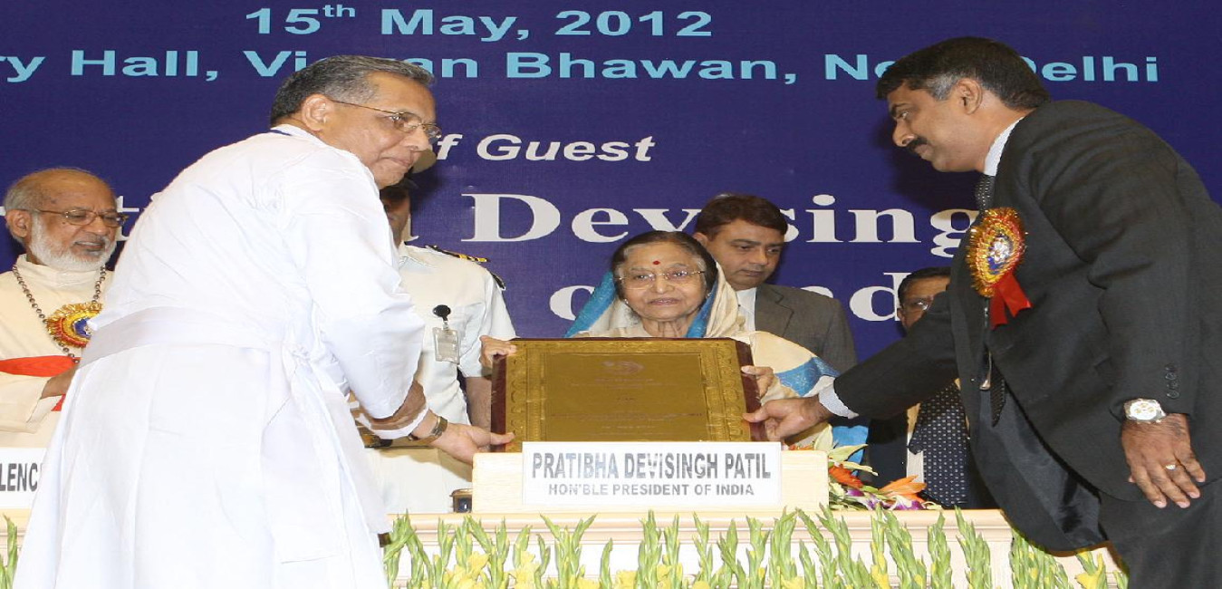 The President of India, Smt Pratibha Devisingh Patil presenting the Nirmal Gram Puraskar during a Presentation Ceremony at a Function at Vigyan Bhavan in New Delhi on March 21, 2012
