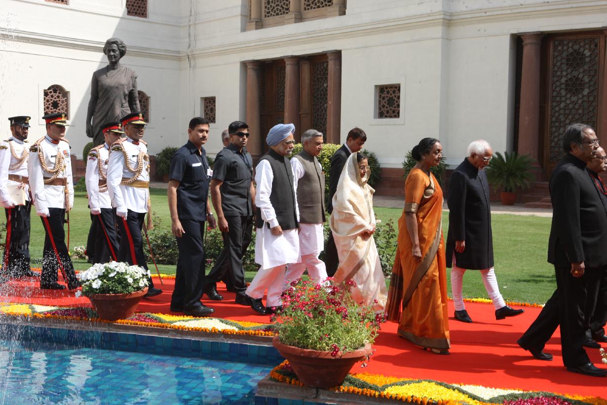 The President of India, Smt Pratibha Devisingh Patil walking in Procession towards the Central Hall of Parliament to deliver her address to both the Houses of Parliament at Parliament House in New Delhi on March 12, 2012