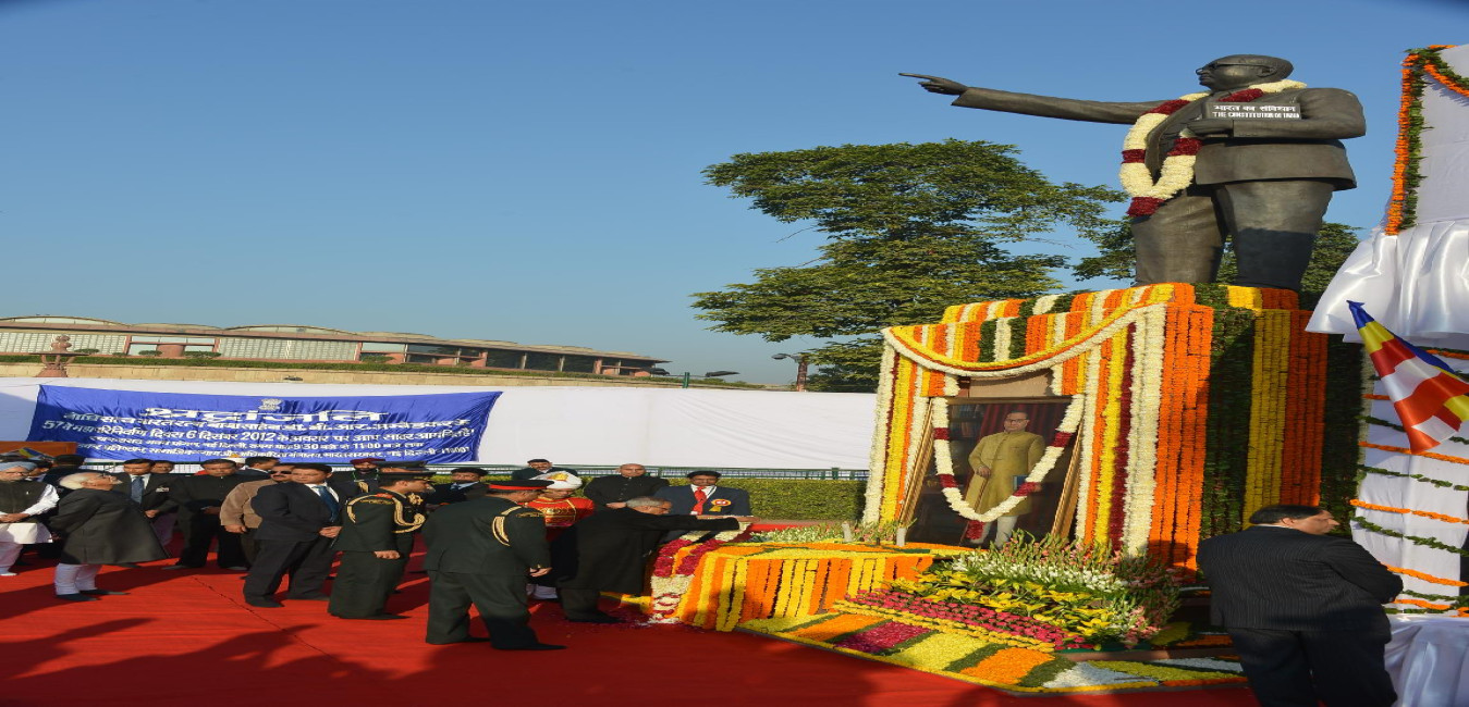The President of India, Shri Pranab Mukherjee Offering Floral Tributes to The Statue of Baba Saheb Dr BR Ambedkar on Dec 06, 2012