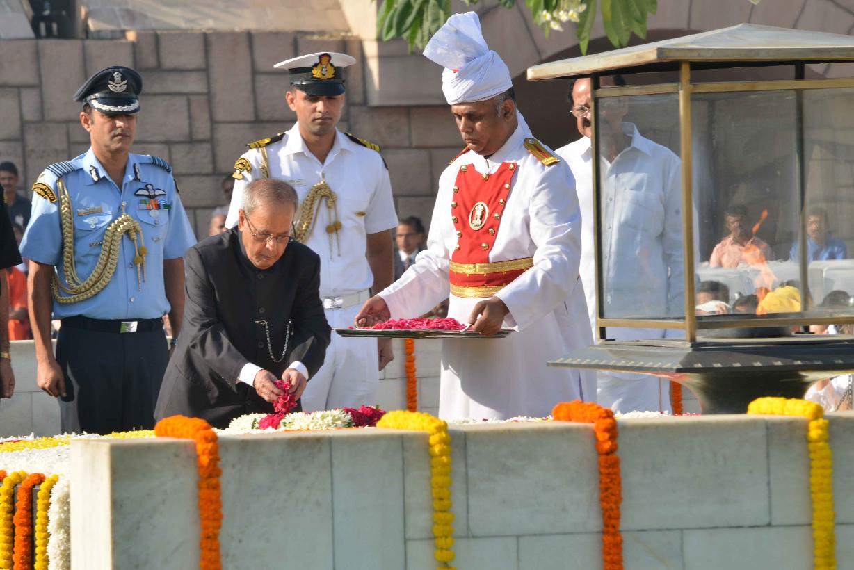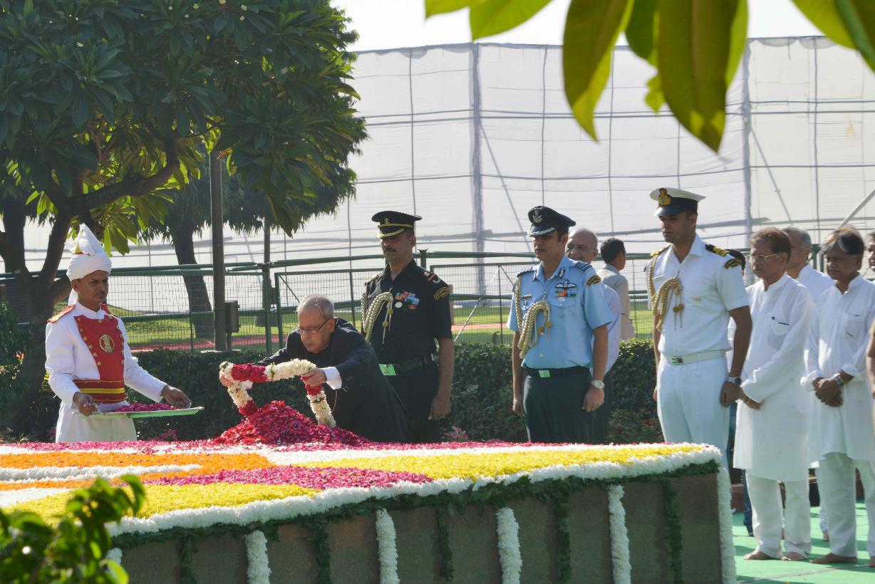 The President of India, Shri Pranab Mukherjee paying floral tributes at the Samadhi of Mahatma Gandhi on the occasion of his 146th Birth Anniversary, at Rajghat, in Delhi on October 02, 2015 .
