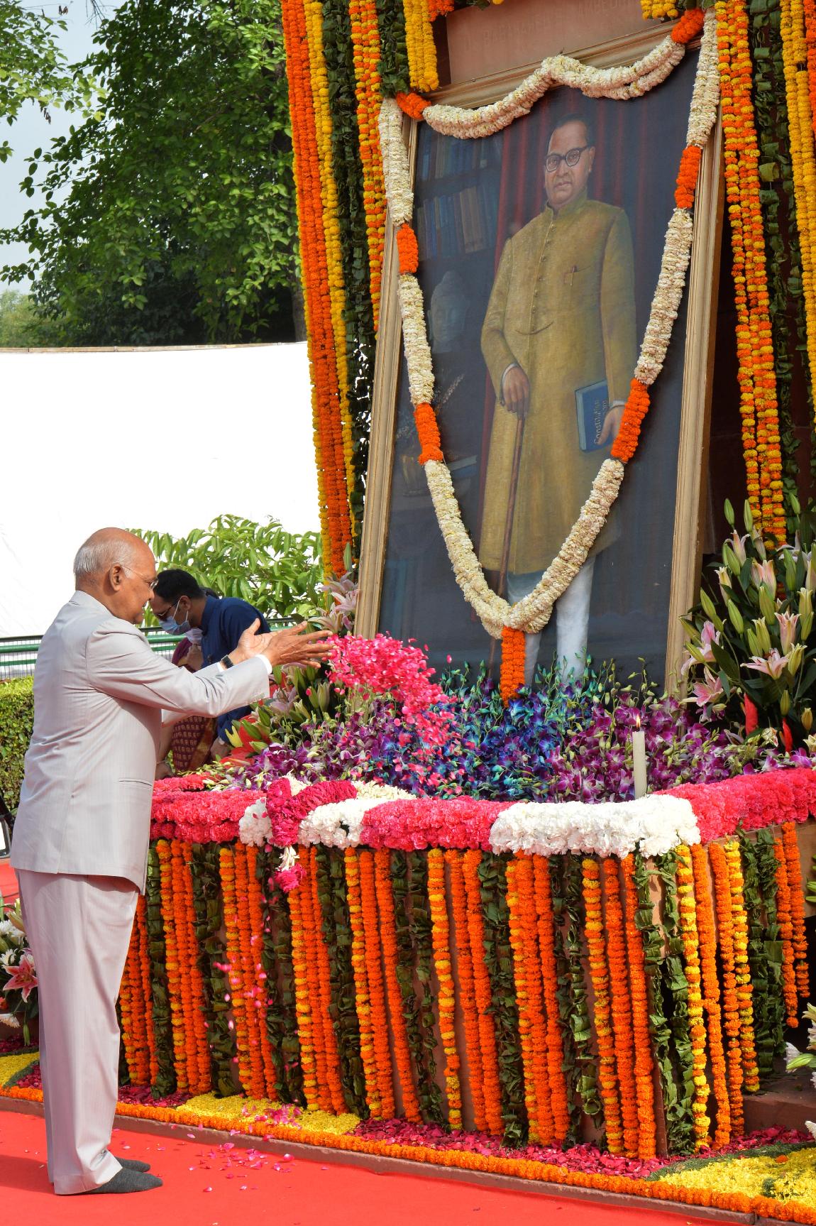 The President of India, Shri Ram Nath Kovind paying floral tributes to Babasaheb Dr. B.R. Ambedkar on his birth anniversary, in New Delhi on April 14, 2022.
