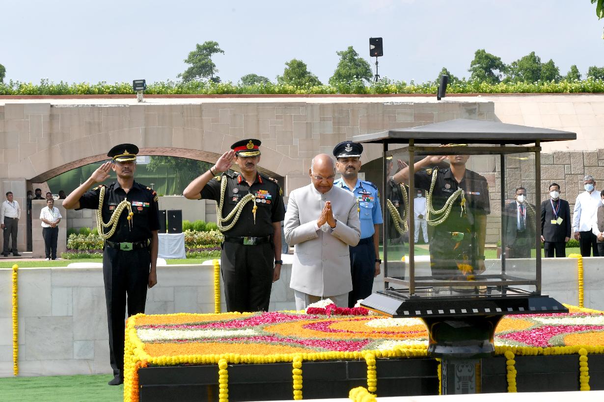 The President of India, Shri Ram Nath Kovind paying homage to Mahatma Gandhi at Rajghat before relinquishing charge as the President of India on July 24, 2022.