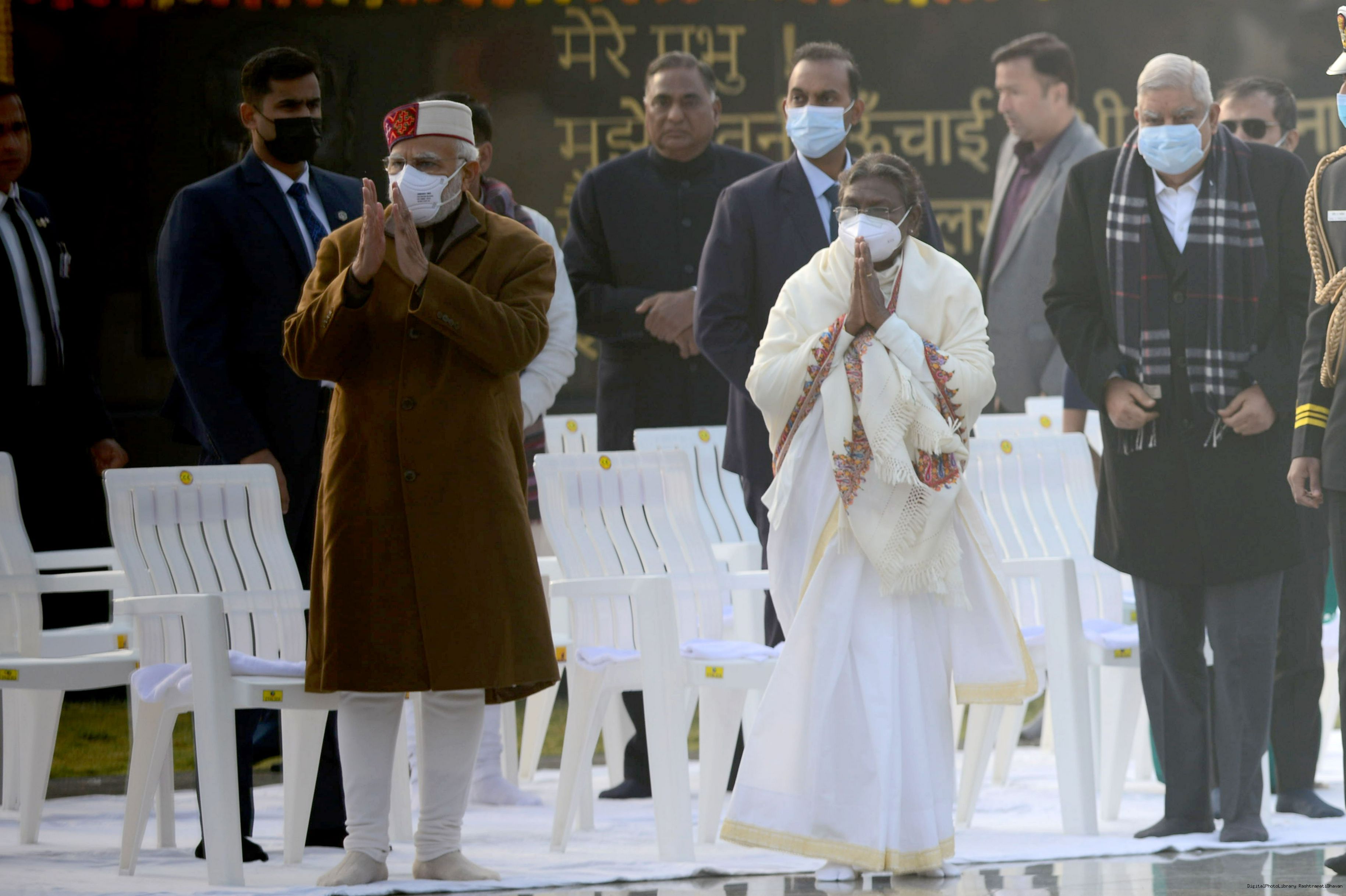 The President of India, Smt. Droupadi Murmu paid floral tributes to Shri Atal Bihari Vajpayee, former Prime Minister of India on his birth anniversary at the samadhi of Atal Ji, 'Sadaiv Atal', in New Delhi on December 25, 2022.