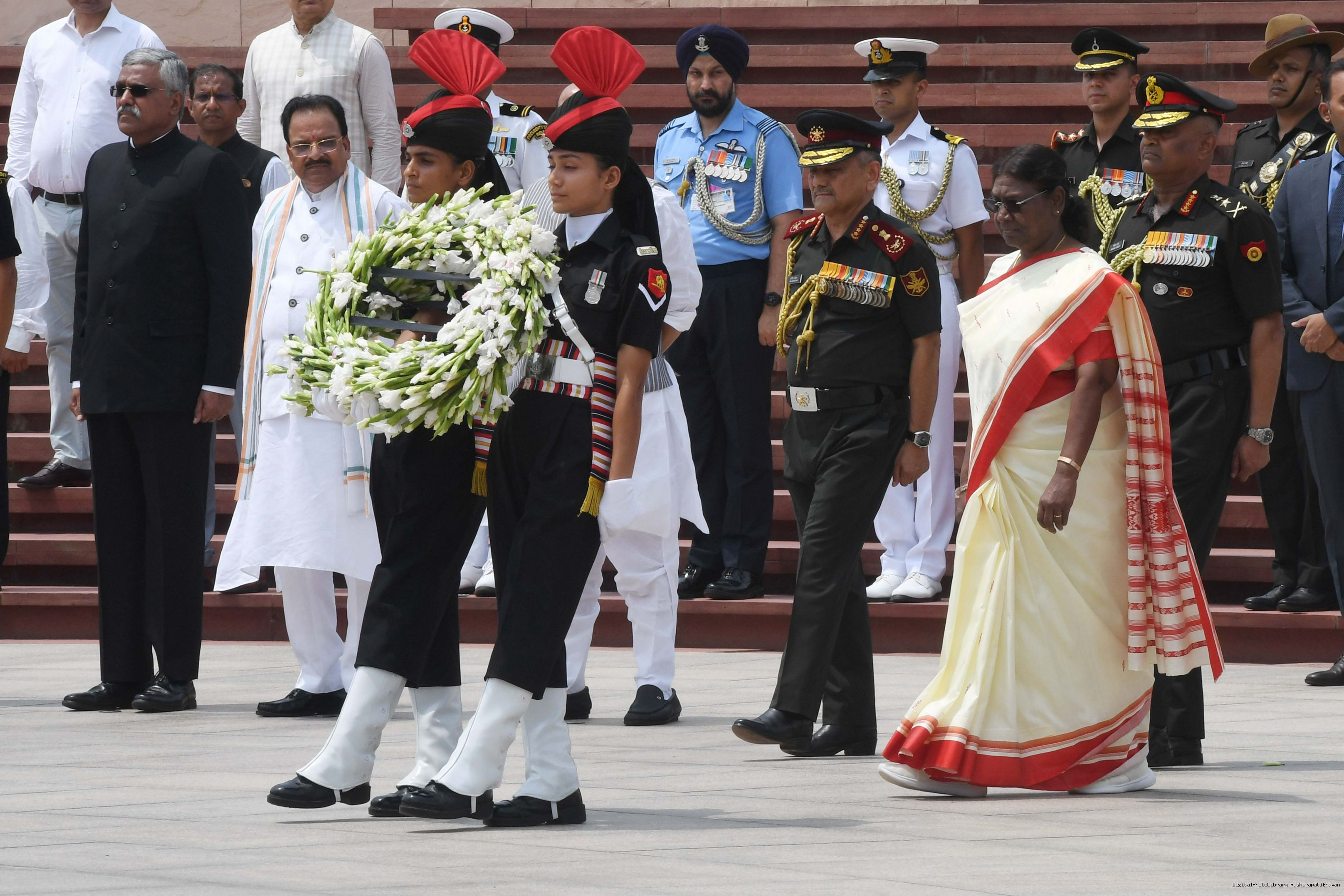The President of India, Smt. Droupadi Murmu Wreath laying the National War Memorial and paid homage to the martyrs, on the occasion of 77th Independence Day, in New Delhi on August 15, 2023.