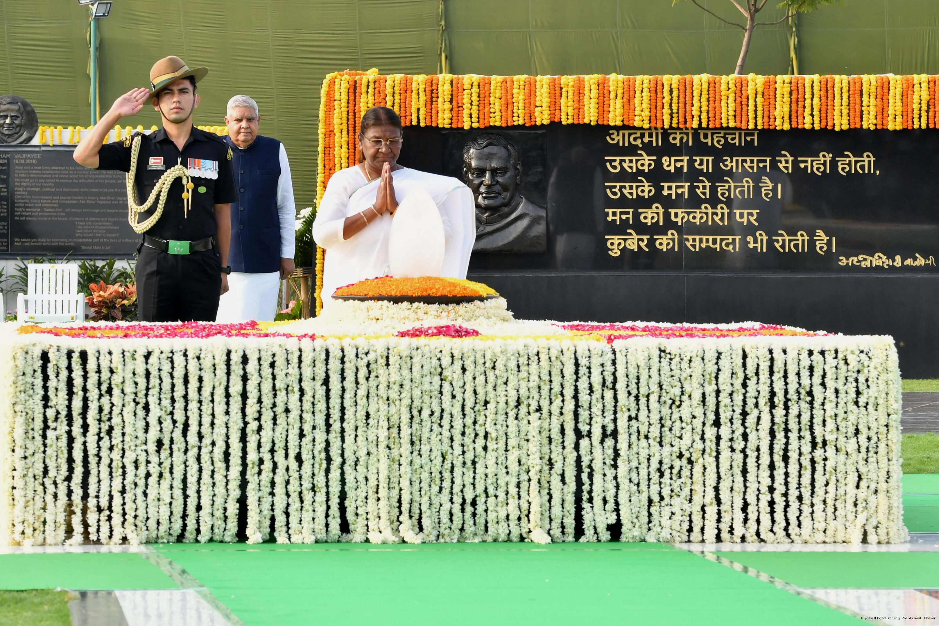 The President of India, Smt. Droupadi Murmu paying homage to Shri Atal Bihari Vajpayee, former Prime Minister of India, on his sixth death anniversary, at Sadaiv Atal, in New Delhi on August 16, 2023.