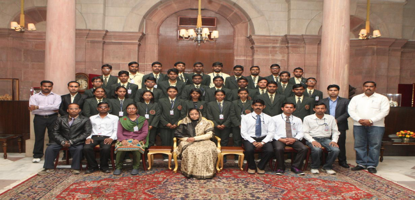 The President of India, Smt Pratibha Devisingh Patil posing for a Group Photograph with Students from Vidya Bharati Mahavidyalaya, Amravati at Rashtrapati Bhavan in New Delhi on Feb 09, 2012