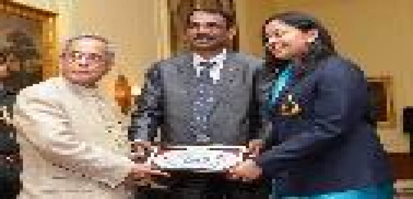 The President of India, Shri Pranab Mukherjee presenting the Sangeet Nataka Akademi's Fellowships (Akademi Ratna) & Akademi Awards 2013 at Rashtrapati Bhavan in New Delhi on April 11, 2014