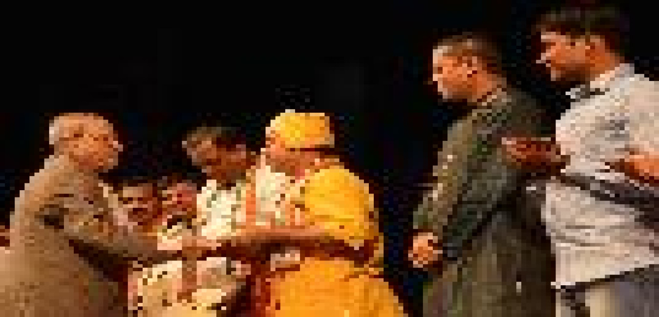 The President of India, Shri Pranab Mukherjee with the artists after witnessing a musical mono act on the Life of 'Soordas' by Shri Shekhar Sen, at Rashtrapati Bhavan Cultural Centre, in New Delhi on April 11, 2015.