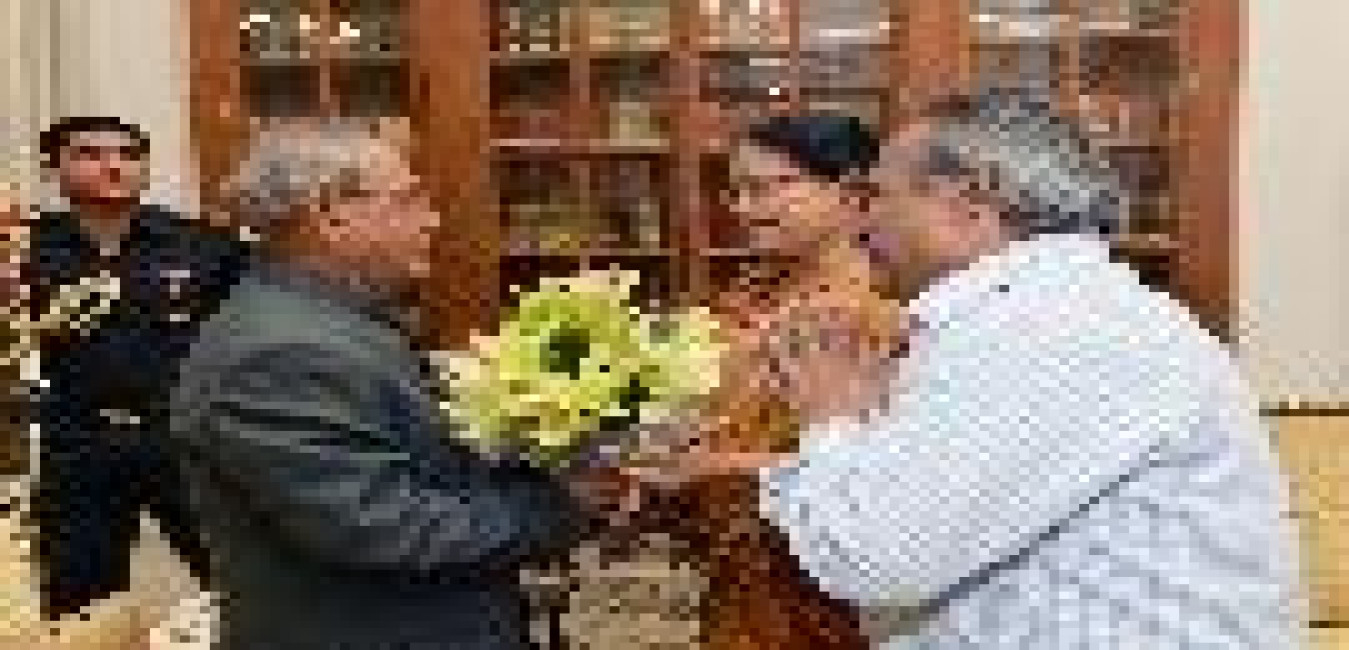 The President of India, Shri Pranab Mukherjee meeting with the former Union Minister, Shri Suresh Pachauri, at Rashtrapati Bhavan, in New Delhi on August 20, 2015.