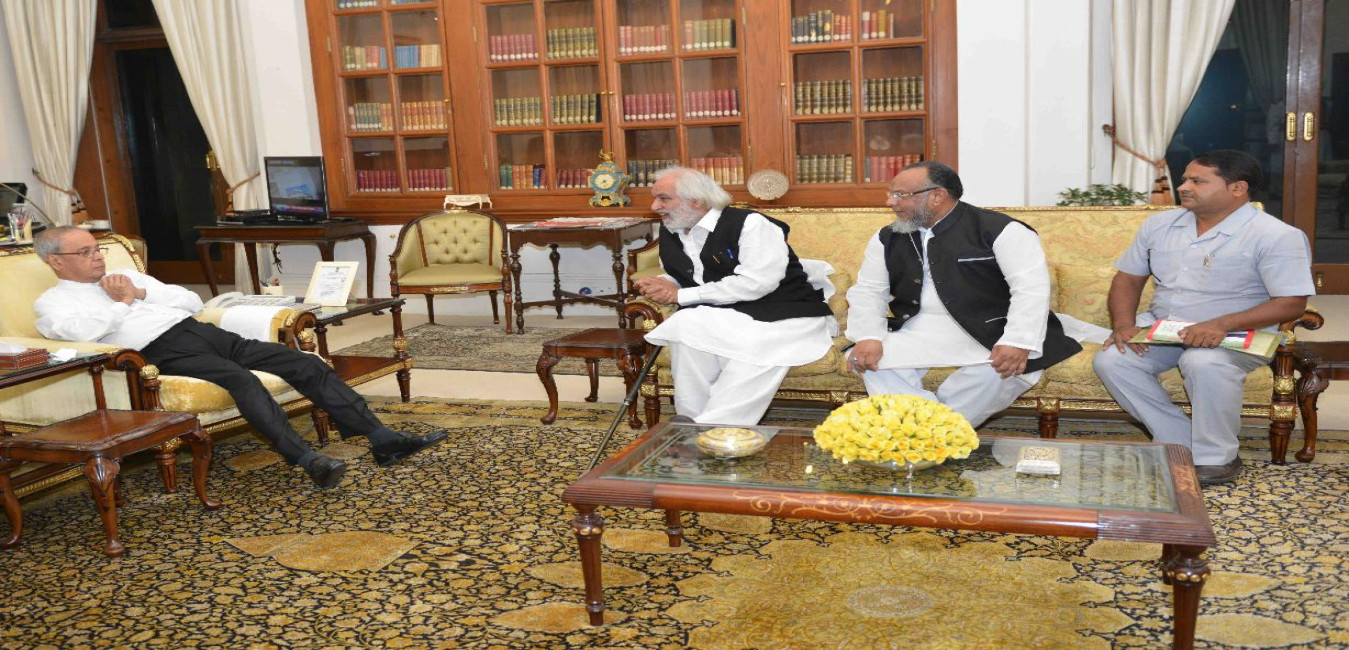 The President of India, Shri Pranab Mukherjee meeting with Chaudhary Munawar Saleem, MP (RS) alongwith Shri Salamat Ullah and Shri Farhat Khan, at Rashtrapati Bhavan, in New Delhi on September 22, 2015.