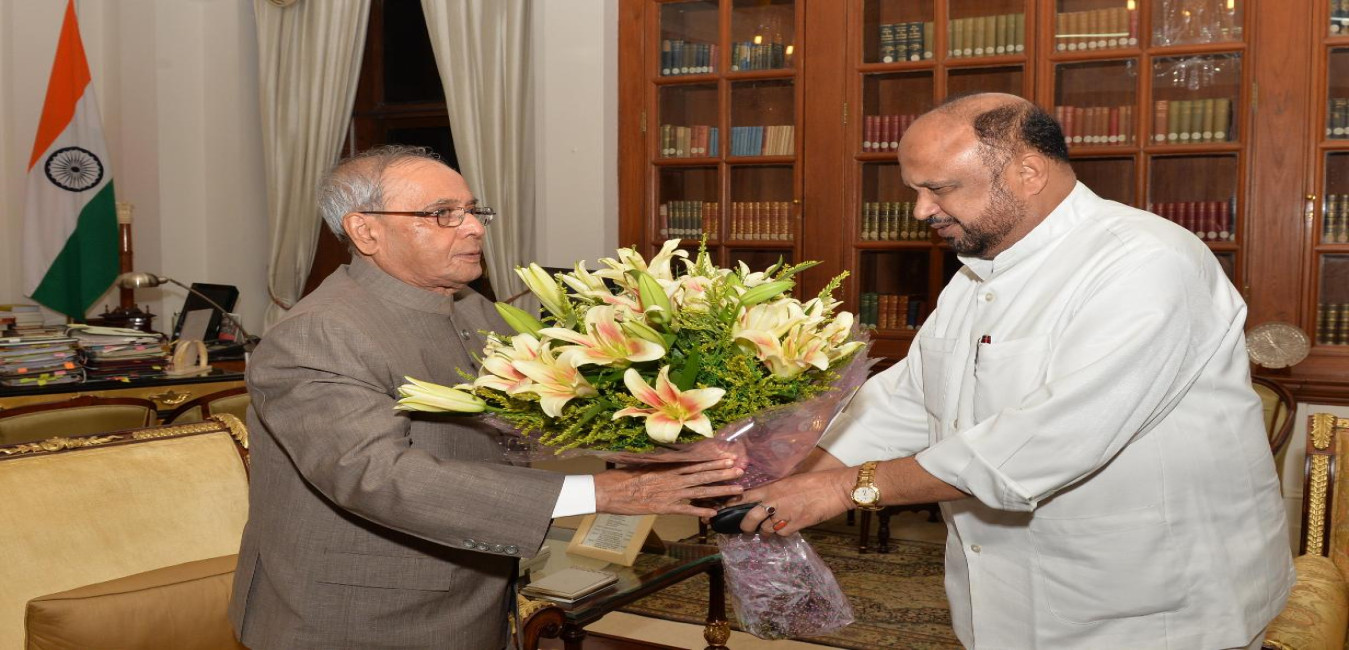 The President of India, Shri Pranab Mukherjee meeting with Dr. G. Vivekanand, Ex-MP (LS) and Shri G. Vinod from Hyderabad, at Rashtrapati Bhavan, in New Delhi on September 22, 2015.