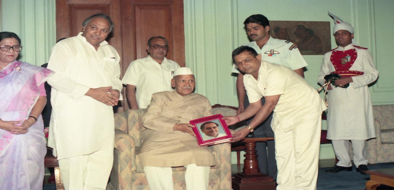 The President of India, Dr. Shankar Dayal Sharma receiving a copy of the book "Rajiv Gandhi: An Assessment" (Second revised edition) from Shri Adish C, Aggarwal with others at Rashtrapati Bhavan in New Delhi on August 20, 1995.