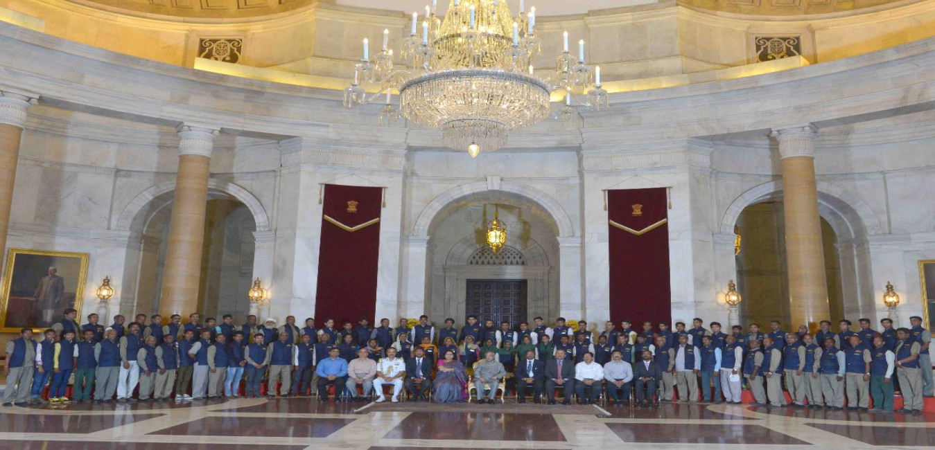 The President of India, Shri Pranab Mukherjee in group photographs with the Rashtrapati Bhavan Staff (Permanent & Contractual) attending training under Pradhan Mantri Kaushal Vikas Yojana (PMKVY) and the Officials of National Skill Development Corporation (NSDC), Ministry of Skill Development and Entrepreneurships, at Rashtrapati Bhavan on May 14, 2016.