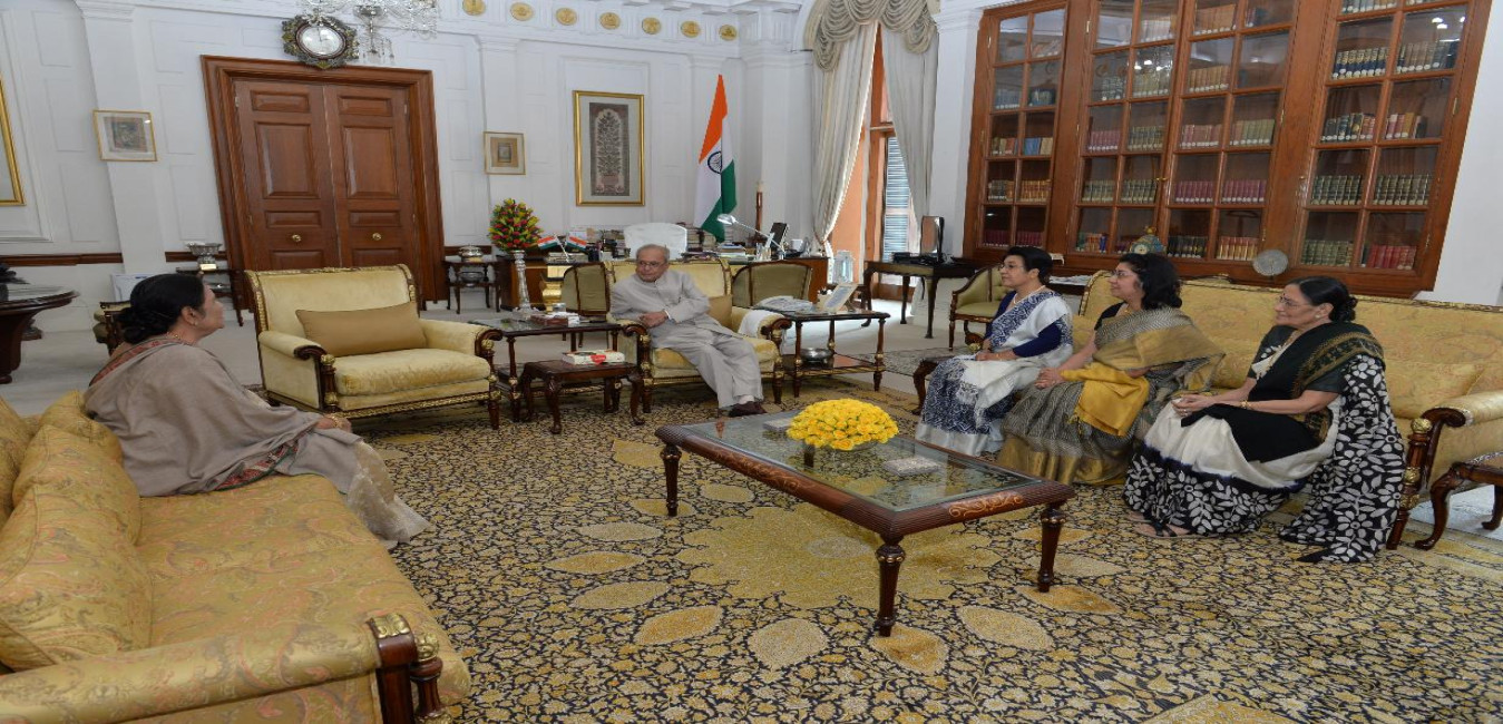The President of India, Shri Pranab Mukherjee meeting with Ms. Chandana Mukherjee, Ms. Bandana Chatterjee, Ms. Devarati Mukherjee and Ms. Kakoli Choudhuri, at Rashtrapati Bhavan on March 15, 2017.