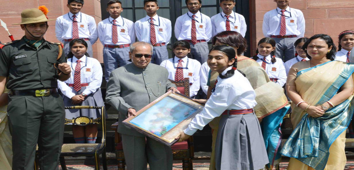 The President of India, Shri Pranab Mukherjee with the students from Army Public School, Barrackpore attending the National Integration Tour, organised by 2 Naga (Mashkoh), at Rashtrapati Bhavan on March 27, 2017.