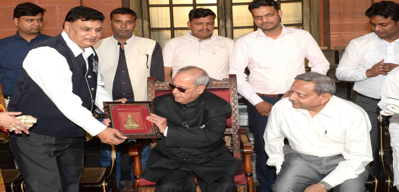 The President of India, Shri Pranab Mukherjee meeting with Shri Pravin Kumar Jain, City Editor, Mahalaxmi Group of Publications along with a delegation, on the occasion of Mahavir Jayanti, at Rashtrapati Bhavan on April 08, 2017.