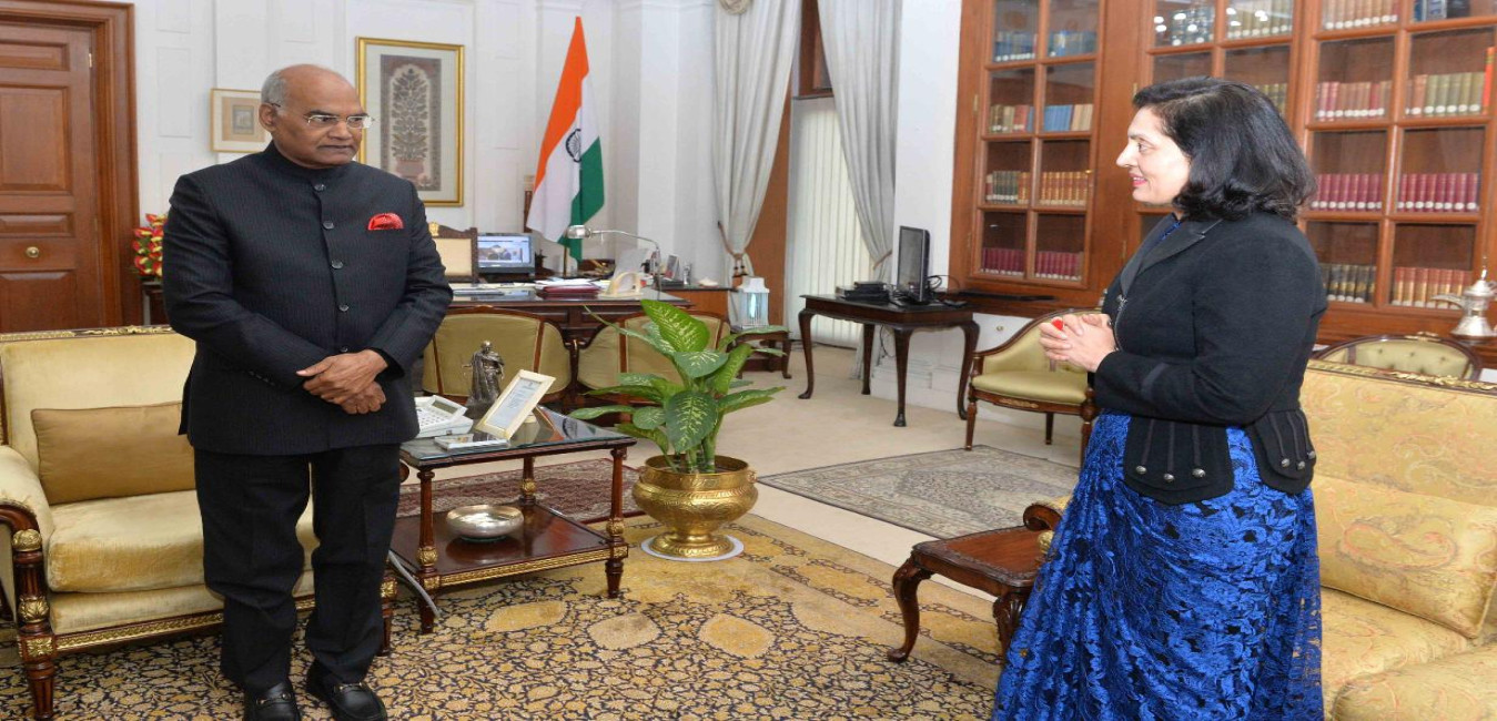 The High Commissioner of India to South Africa, Ms. Ruchira Kamboj calling on the President of India, Shri Ram Nath Kovind, at Rashtrapati Bhavan on January 03, 2018.