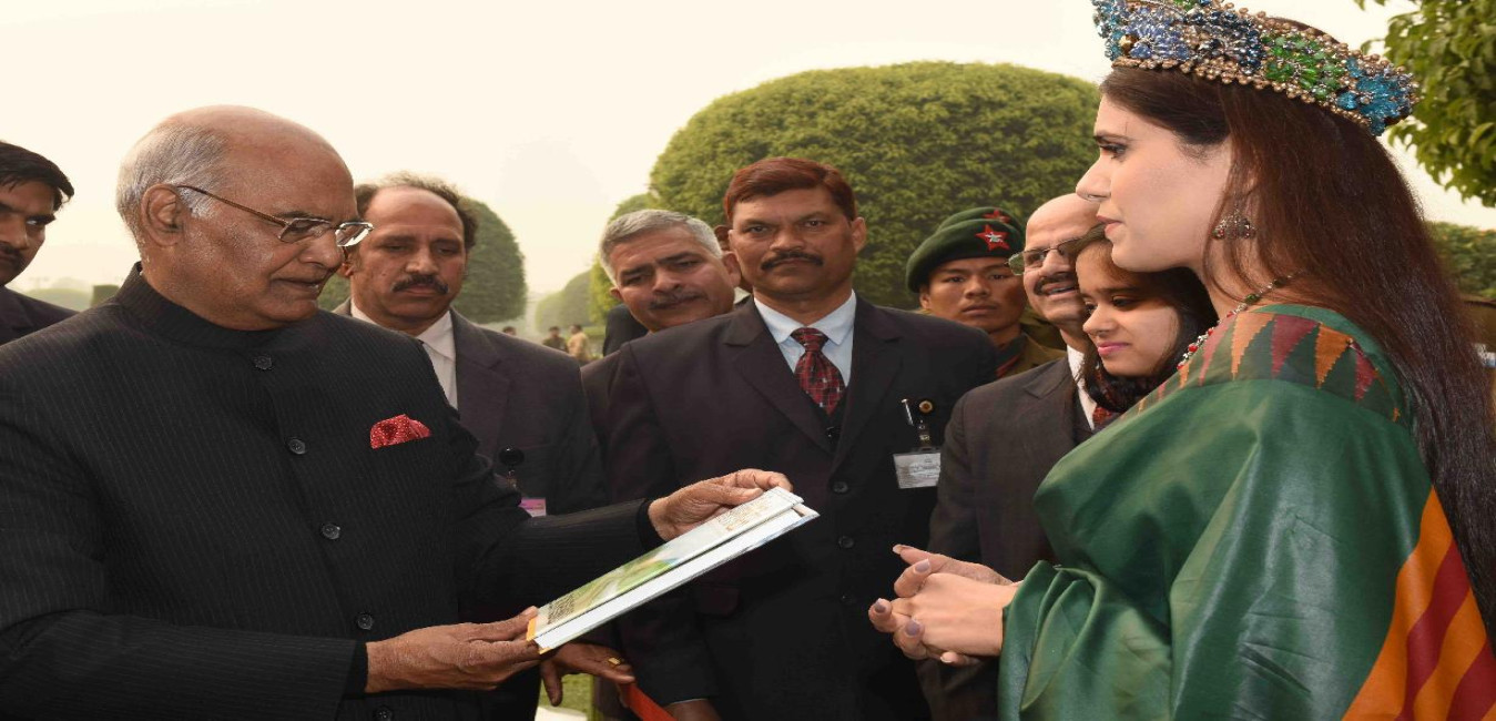 The students from Dibrugarh and Charaideo Districts of Assam attending National Integration Tour, organised by the HQ 2 Mountain Artillery Brigade meeting with the President of India, Shri Ram Nath Kovind, at Rashtrapati Bhavan on January 02, 2018.