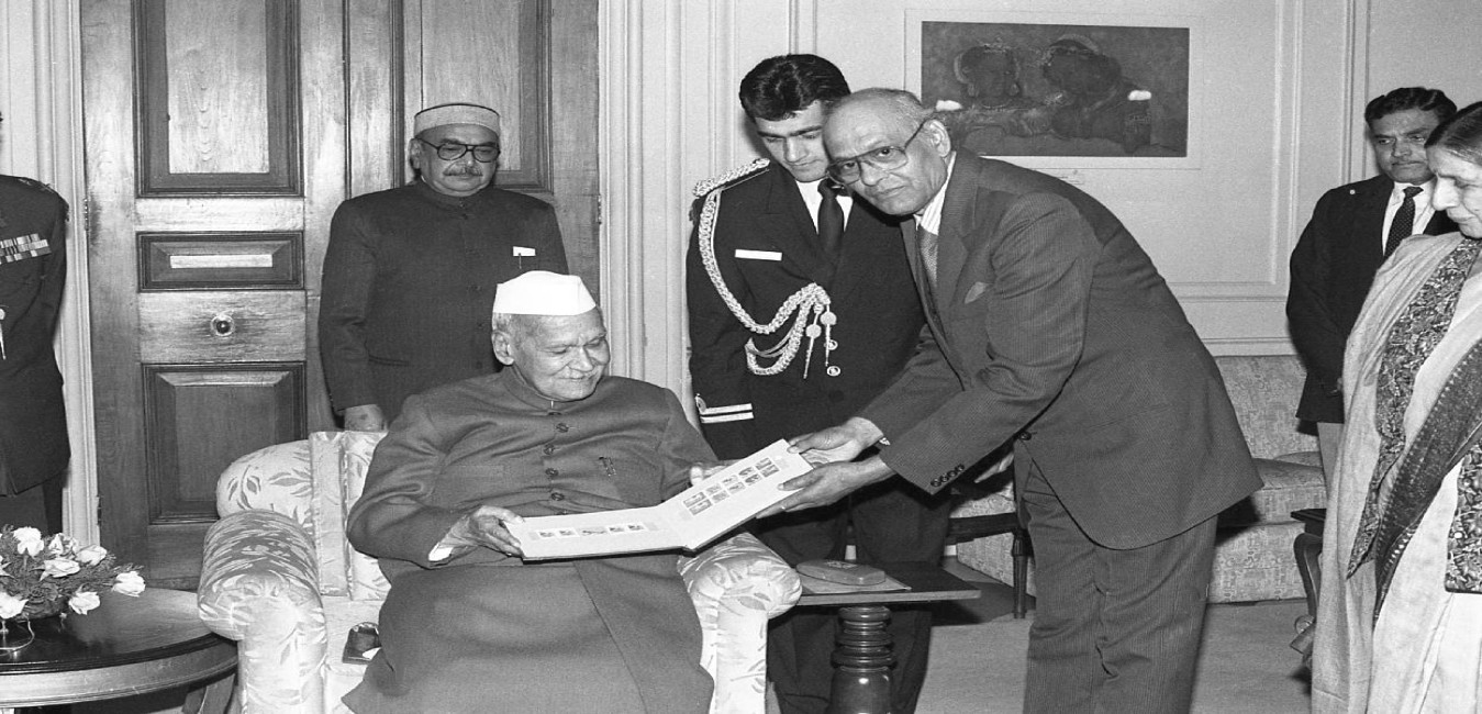 The President of India, Dr. Shankar Dayal Sharma receiving a copy of the book from Shri Deepak Yogi at Rashtrapati Bhavan in New Delhi on January 14, 1997.
