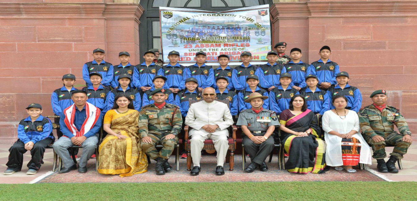 The President of India, Shri Ram Nath Kovind meeting with the students and teachers from Tamenglong, Manipur attending National Integration Tour (NIT), organised by the 23 Assam Rifles under the Aegis of HQ DG Assam Rifles, at Rashtrapati Bhavan on September 20, 2018.
