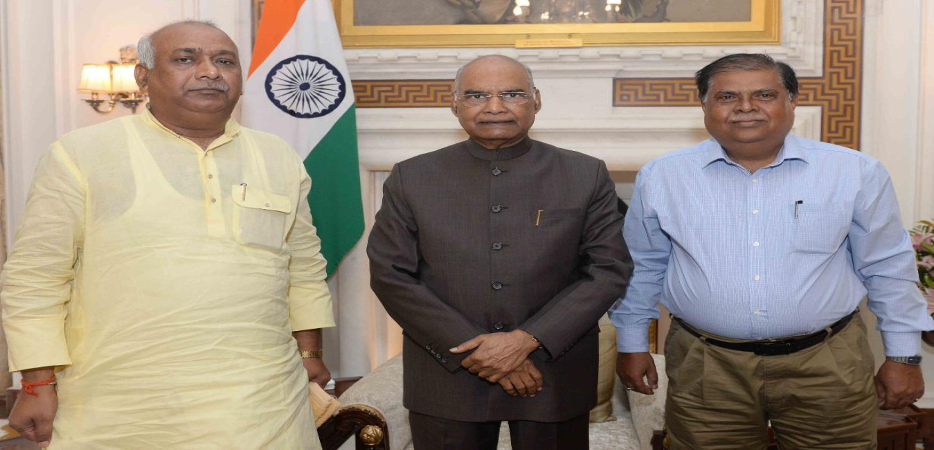 Shri Ram Shakal, MP (Rajya Sabha) along with Shri Ghanshyam Pandey, Member, Akhil Bhartiya Vanvasi Kalyan Ashram, Uttar Pradesh meeting with the President of India, Shri Ram Nath Kovind, at Rashtrapati Bhavan on August 27, 2019.