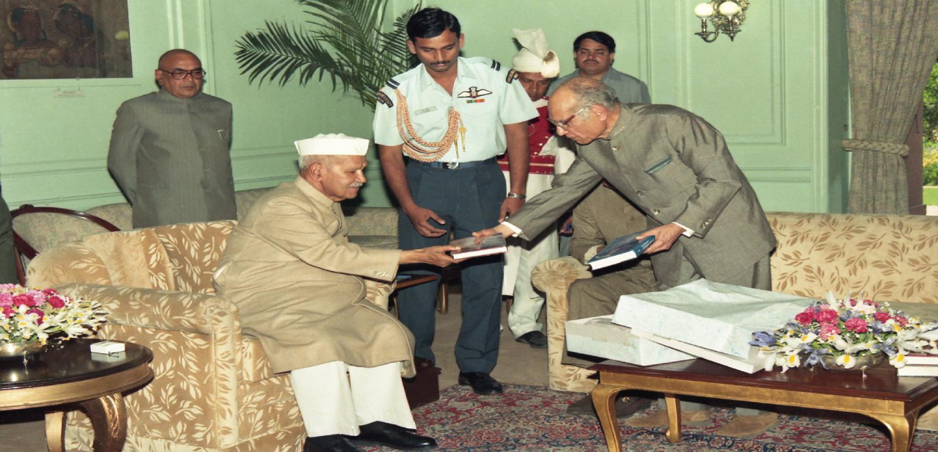 The President of India, Dr. Shankar Dayal Sharma receiving collected Works of Pandit Govind Ballabh Pant from Shri B.R. Nanda, Chief Editor at Rashtrapati Bhavan in New Delhi on March 11, 1997.