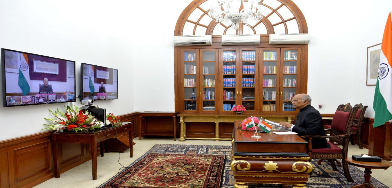 The President of India, Shri Ram Nath Kovind along with the Vice President of India, interacts with the Governors, Lt Governors and Administrators of all the States and Union Territories through video conferencing to discuss measures to combat COVID-19, at Rashtrapati Bhavan on April 03, 2020.