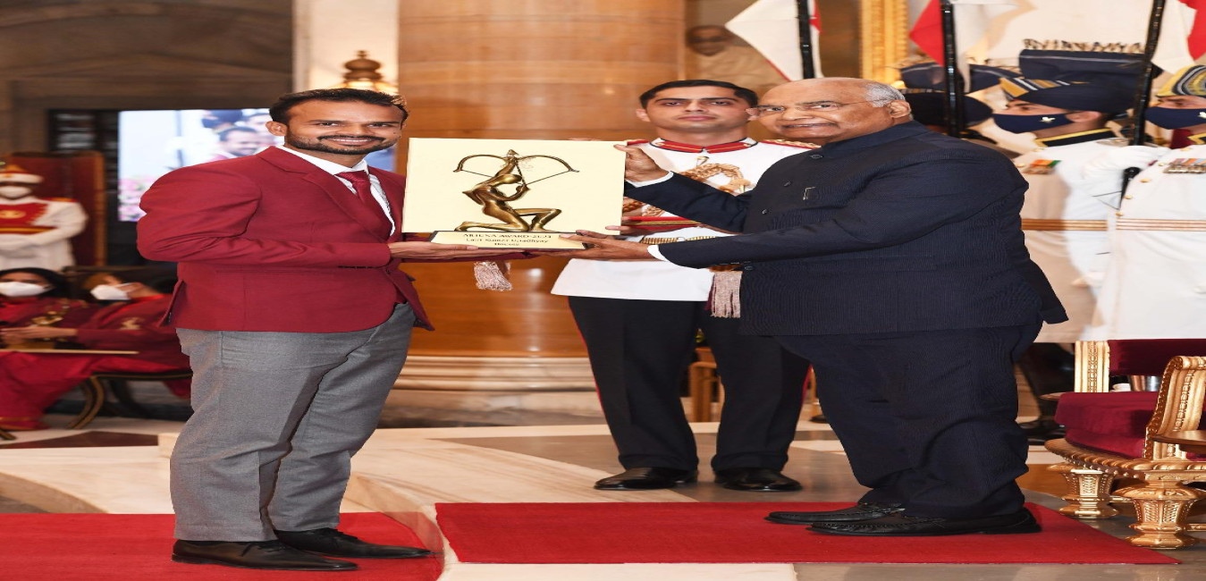 The President of India, Shri Ram Nath Kovind presenting Major Dhyan Chand Khel Ratna Award, 2021, at the Sports & Adventure Awards function, at Rashtrapati Bhavan on November 13, 2021.