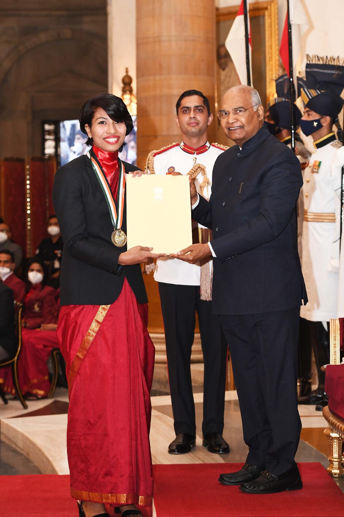The President of India, Shri Ram Nath Kovind presenting Tenzing Norgay National Adventure Award, 2020, at the Sports & Adventure Awards function, at Rashtrapati Bhavan on November 13, 2021.
