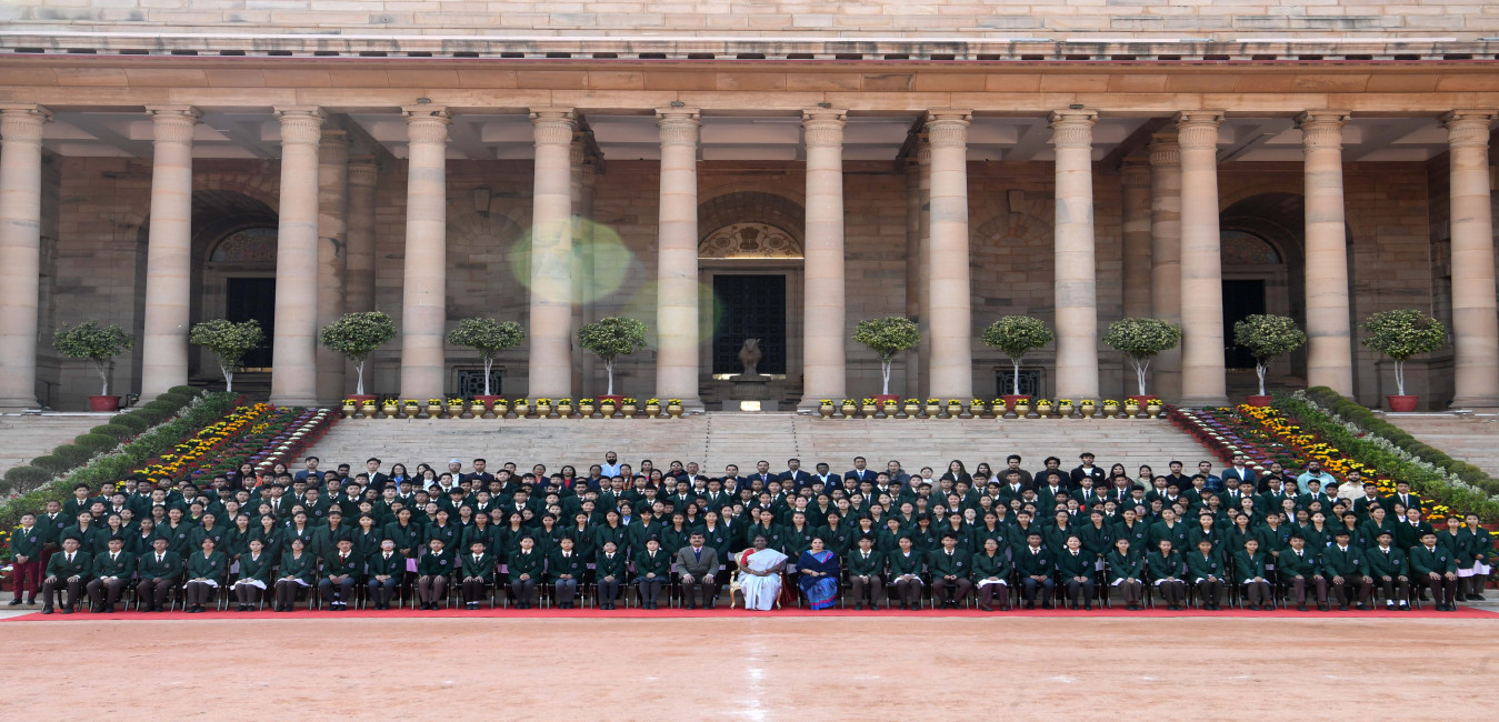The President of India, Smt Droupadi Murmu posing for Group Photograph with Group photograph with students of Eklavya Model Residential School (EMRS) from North East with escorts at Rashtrapati Bhavan on February 8, 2024.