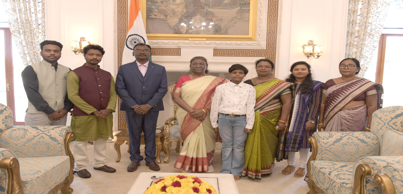 Shri Ritesh Kumar Athghara from Rairangpur along with others meeting with the President of India Smt Droupadi Murmu at Rashtrapati Bhavan on March 28, 2024.