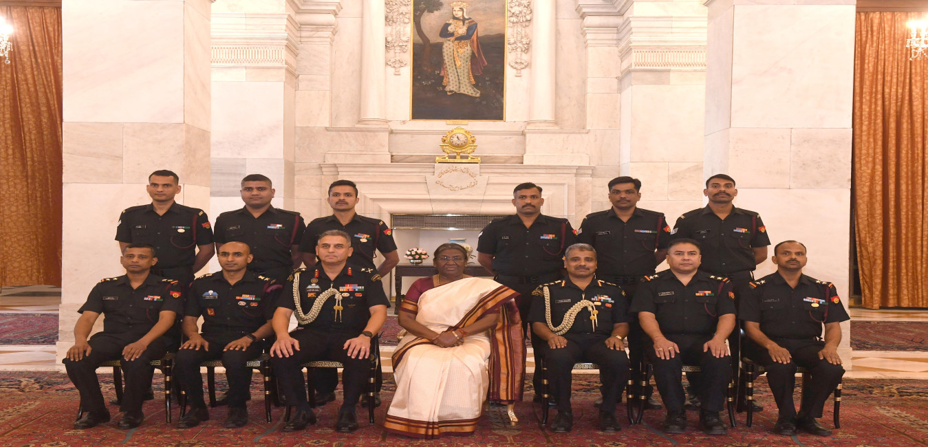 The President of India, Smt Droupadi Murmu posing for a Group Photograph with persons from Army Medical Corps (AMC) at Rashtrapati Bhavan on April 3, 2024.