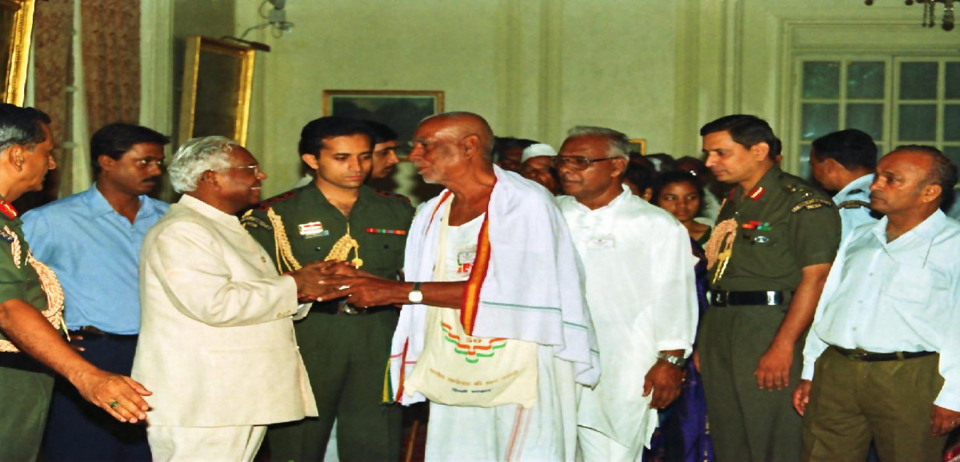 The President of India, Shri K R Narayanan meeting with the Delegation of Freedom Fighters from Kerala led by Shri T Govindan at the Committee Room of Rashtrapati Bhavan in New Delhi on Aug 16, 1997