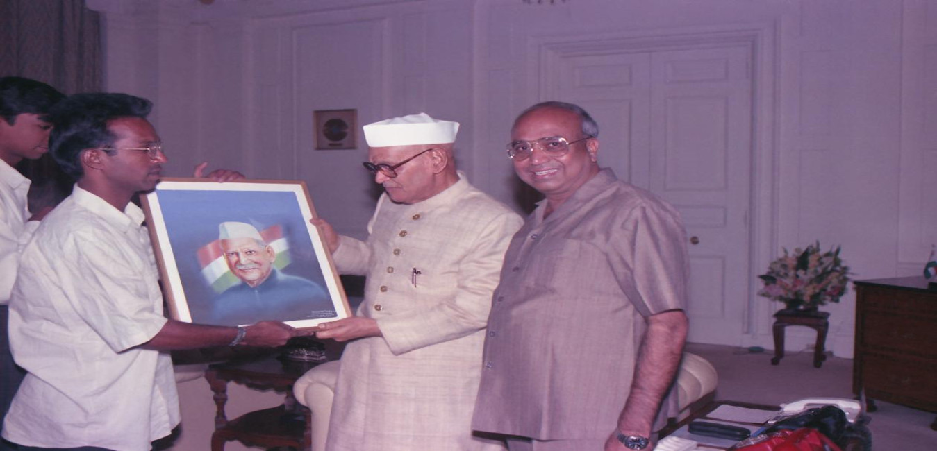 The President of India, Dr. Shankar Dayal Sharma receiving paintings from Dr. P. Shankar Rao with Shri Narendra Reddy at Rashtrapati Bhavan in New Delhi on June 10, 1994.