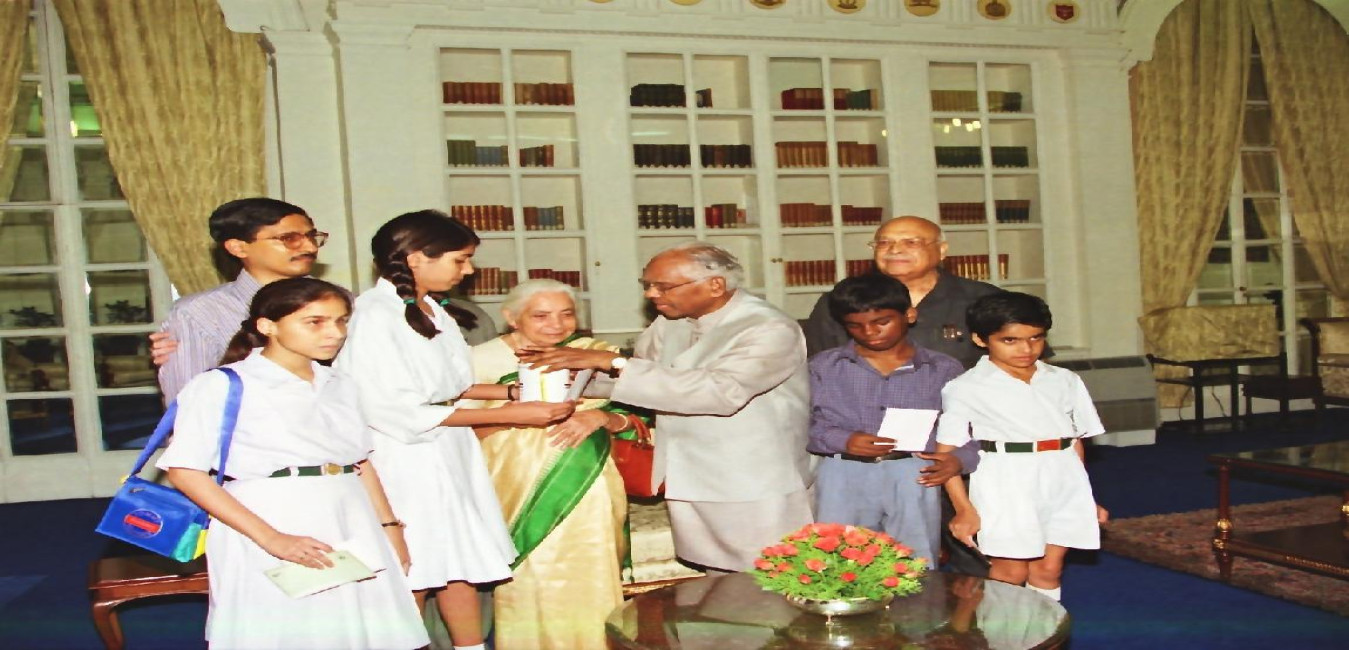 The President of India, Shri K R Narayanan interacting with the Children and Office Bearers of the National Association for the Blind to pinning a flag on the occasion of their Flag Day of Rashtrapati Bhavan in New Delhi on Sep 16, 2000
